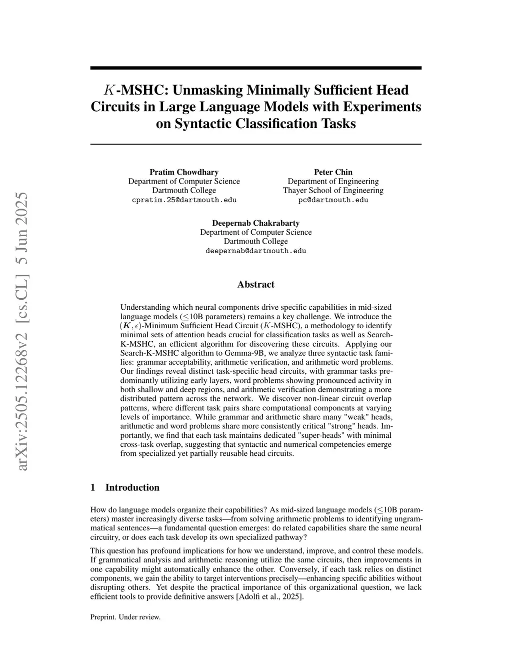 Understanding which neural components drive specific capabilities in mid-sized language models (10B parameters) remains a key challenge. We introduce the -Minimum Sufficient Head Circuit (-MSHC), a methodology to identify minimal sets of attention heads crucial for classification tasks as well as Search-K-MSHC, an efficient algorithm for discovering these circuits. Applying our Search-K-MSHC algorithm to Gemma-9B, we analyze three syntactic task families: grammar acceptability, arithmetic verification, and arithmetic word problems. Our findings reveal distinct task-specific head circuits, with grammar tasks predominantly utilizing early layers, word problems showing pronounced activity in both shallow and deep regions, and arithmetic verification demonstrating a more distributed pattern across the network. We discover non-linear circuit overlap patterns, where different task pairs share computational components at varying levels of importance. While grammar and arithmetic share many "weak" heads, arithmetic and word problems share more consistently critical "strong" heads. Importantly, we find that each task maintains dedicated "super-heads" with minimal cross-task overlap, suggesting that syntactic and numerical competencies emerge from specialized yet partially reusable head circuits.