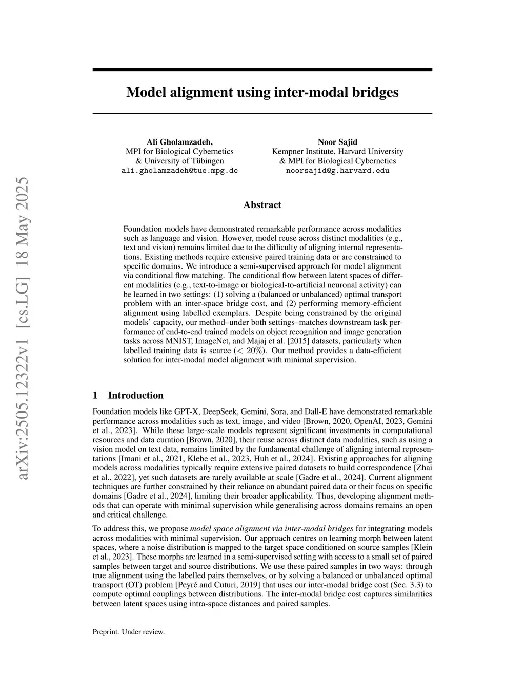 Foundation models have demonstrated remarkable performance across modalities such as language and vision. However, model reuse across distinct modalities (e.g., text and vision) remains limited due to the difficulty of aligning internal representations. Existing methods require extensive paired training data or are constrained to specific domains. We introduce a semi-supervised approach for model alignment via conditional flow matching. The conditional flow between latent spaces of different modalities (e.g., text-to-image or biological-to-artificial neuronal activity) can be learned in two settings: () solving a (balanced or unbalanced) optimal transport problem with an inter-space bridge cost, and () performing memory-efficient alignment using labelled exemplars. Despite being constrained by the original models' capacity, our method--under both settings--matches downstream task performance of end-to-end trained models on object recognition and image generation tasks across MNIST, ImageNet, and \cite{majaj2015simple} datasets, particularly when labelled training data is scarce (). Our method provides a data-efficient solution for inter-modal model alignment with minimal supervision.