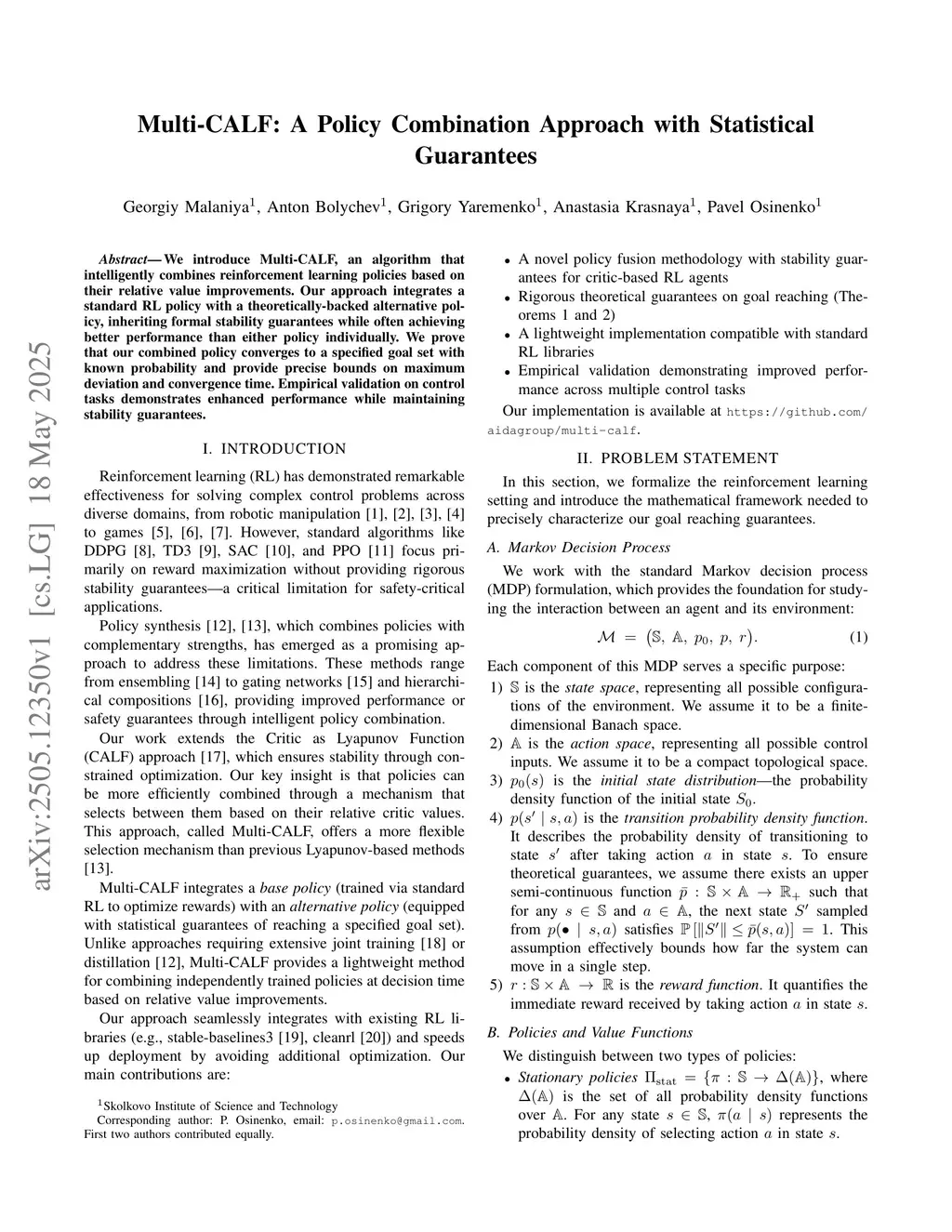 We introduce Multi-CALF, an algorithm that intelligently combines reinforcement learning policies based on their relative value improvements. Our approach integrates a standard RL policy with a theoretically-backed alternative policy, inheriting formal stability guarantees while often achieving better performance than either policy individually. We prove that our combined policy converges to a specified goal set with known probability and provide precise bounds on maximum deviation and convergence time. Empirical validation on control tasks demonstrates enhanced performance while maintaining stability guarantees.