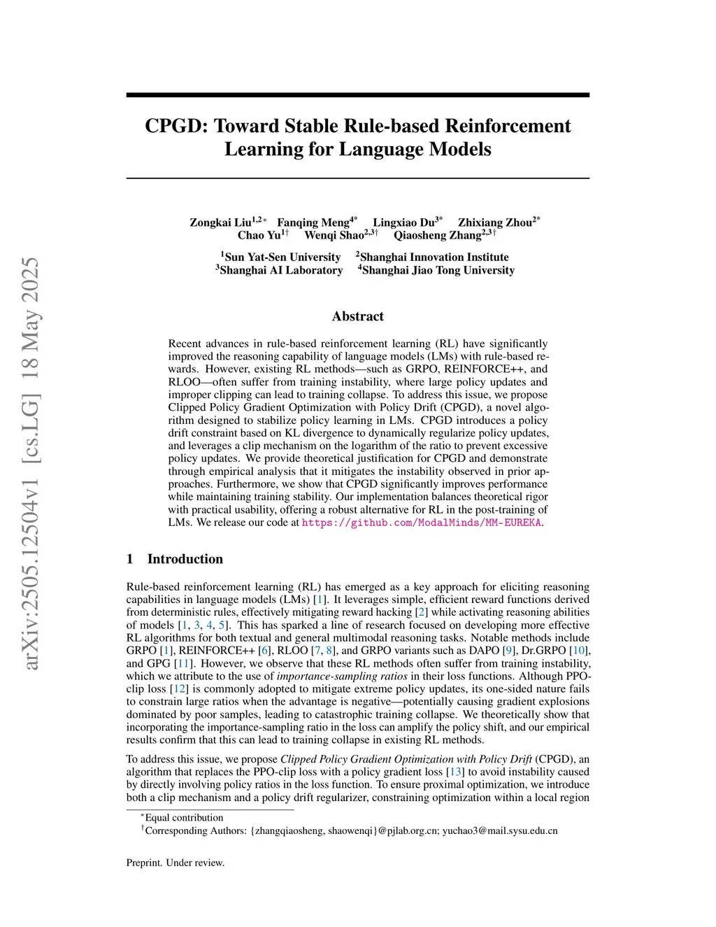 Recent advances in rule-based reinforcement learning (RL) have significantly improved the reasoning capability of language models (LMs) with rule-based rewards. However, existing RL methods -- such as GRPO, REINFORCE++, and RLOO -- often suffer from training instability, where large policy updates and improper clipping can lead to training collapse. To address this issue, we propose Clipped Policy Gradient Optimization with Policy Drift (CPGD), a novel algorithm designed to stabilize policy learning in LMs. CPGD introduces a policy drift constraint based on KL divergence to dynamically regularize policy updates, and leverages a clip mechanism on the logarithm of the ratio to prevent excessive policy updates. We provide theoretical justification for CPGD and demonstrate through empirical analysis that it mitigates the instability observed in prior approaches. Furthermore, we show that CPGD significantly improves performance while maintaining training stability. Our implementation balances theoretical rigor with practical usability, offering a robust alternative for RL in the post-training of LMs. We release our code atthis https URL.