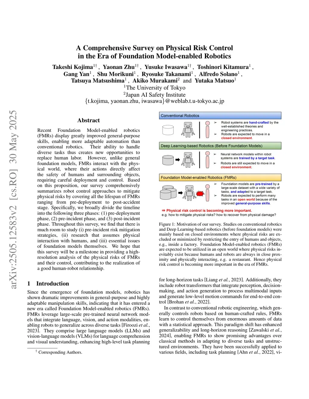 Recent Foundation Model-enabled robotics (FMRs) display greatly improved general-purpose skills, enabling more adaptable automation than conventional robotics. Their ability to handle diverse tasks thus creates new opportunities to replace human labor. However, unlike general foundation models, FMRs interact with the physical world, where their actions directly affect the safety of humans and surrounding objects, requiring careful deployment and control. Based on this proposition, our survey comprehensively summarizes robot control approaches to mitigate physical risks by covering all the lifespan of FMRs ranging from pre-deployment to post-accident stage. Specifically, we broadly divide the timeline into the following three phases: (1) pre-deployment phase, (2) pre-incident phase, and (3) post-incident phase. Throughout this survey, we find that there is much room to study (i) pre-incident risk mitigation strategies, (ii) research that assumes physical interaction with humans, and (iii) essential issues of foundation models themselves. We hope that this survey will be a milestone in providing a high-resolution analysis of the physical risks of FMRs and their control, contributing to the realization of a good human-robot relationship.