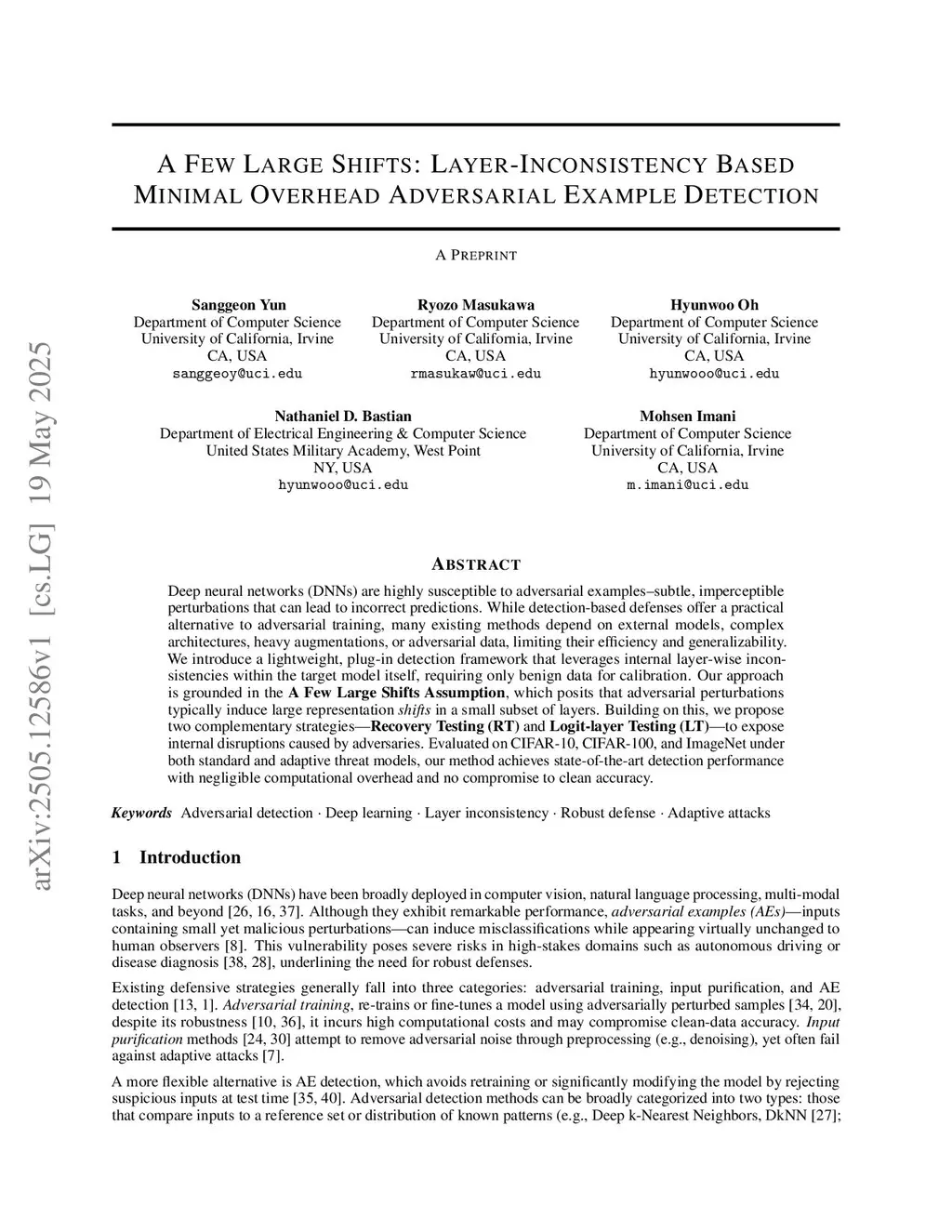 Deep neural networks (DNNs) are highly susceptible to adversarial examples--subtle, imperceptible perturbations that can lead to incorrect predictions. While detection-based defenses offer a practical alternative to adversarial training, many existing methods depend on external models, complex architectures, or adversarial data, limiting their efficiency and generalizability. We introduce a lightweight, plug-in detection framework that leverages internal layer-wise inconsistencies within the target model itself, requiring only benign data for calibration. Our approach is grounded in the A Few Large Shifts Assumption, which posits that adversarial perturbations induce large, localized violations of layer-wise Lipschitz continuity in a small subset of layers. Building on this, we propose two complementary strategies--Recovery Testing (RT) and Logit-layer Testing (LT)--to empirically measure these violations and expose internal disruptions caused by adversaries. Evaluated on CIFAR-10, CIFAR-100, and ImageNet under both standard and adaptive threat models, our method achieves state-of-the-art detection performance with negligible computational overhead. Furthermore, our system-level analysis provides a practical method for selecting a detection threshold with a formal lower-bound guarantee on accuracy. The code is available here:this https URL.