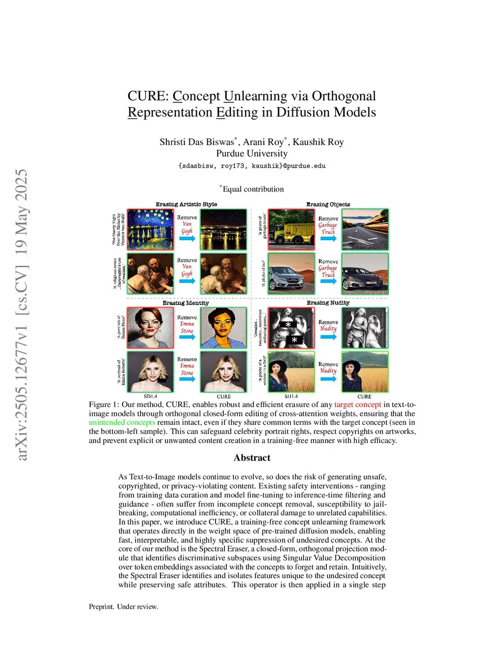 CURE: Concept Unlearning via Orthogonal Representation Editing in Diffusion Models