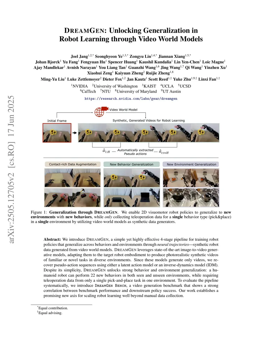 We introduce DreamGen, a simple yet highly effective 4-stage pipeline for training robot policies that generalize across behaviors and environments through neural trajectories - synthetic robot data generated from video world models. DreamGen leverages state-of-the-art image-to-video generative models, adapting them to the target robot embodiment to produce photorealistic synthetic videos of familiar or novel tasks in diverse environments. Since these models generate only videos, we recover pseudo-action sequences using either a latent action model or an inverse-dynamics model (IDM). Despite its simplicity, DreamGen unlocks strong behavior and environment generalization: a humanoid robot can perform 22 new behaviors in both seen and unseen environments, while requiring teleoperation data from only a single pick-and-place task in one environment. To evaluate the pipeline systematically, we introduce DreamGen Bench, a video generation benchmark that shows a strong correlation between benchmark performance and downstream policy success. Our work establishes a promising new axis for scaling robot learning well beyond manual data collection. Code available atthis https URL.