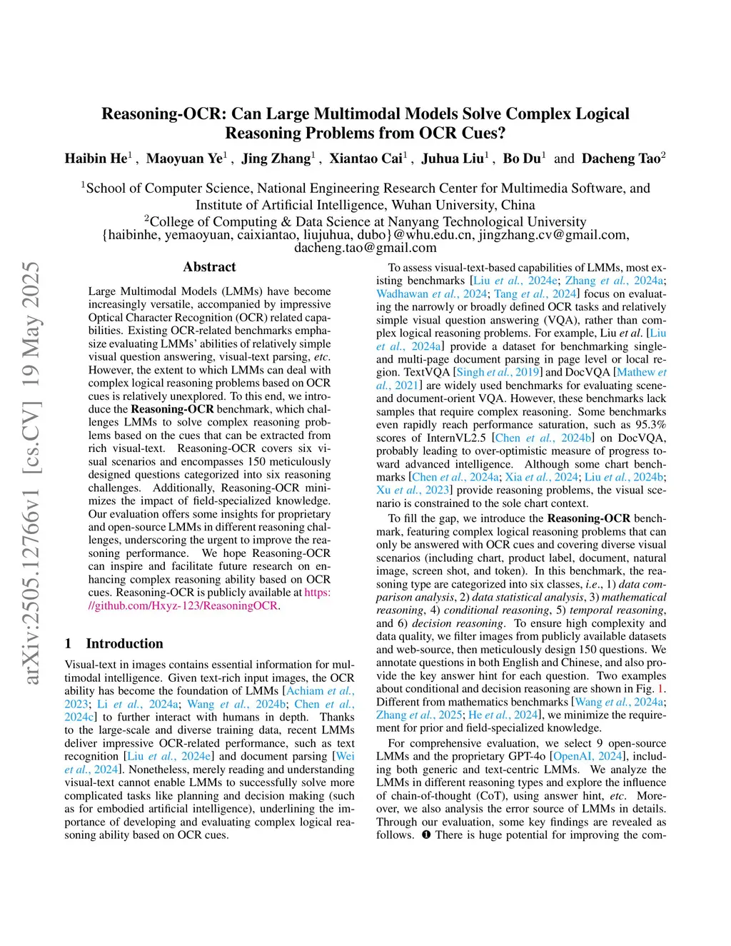 Large Multimodal Models (LMMs) have become increasingly versatile, accompanied by impressive Optical Character Recognition (OCR) related capabilities. Existing OCR-related benchmarks emphasize evaluating LMMs' abilities of relatively simple visual question answering, visual-text parsing, etc. However, the extent to which LMMs can deal with complex logical reasoning problems based on OCR cues is relatively unexplored. To this end, we introduce the Reasoning-OCR benchmark, which challenges LMMs to solve complex reasoning problems based on the cues that can be extracted from rich visual-text. Reasoning-OCR covers six visual scenarios and encompasses 150 meticulously designed questions categorized into six reasoning challenges. Additionally, Reasoning-OCR minimizes the impact of field-specialized knowledge. Our evaluation offers some insights for proprietary and open-source LMMs in different reasoning challenges, underscoring the urgent to improve the reasoning performance. We hope Reasoning-OCR can inspire and facilitate future research on enhancing complex reasoning ability based on OCR cues. Reasoning-OCR is publicly available atthis https URL.