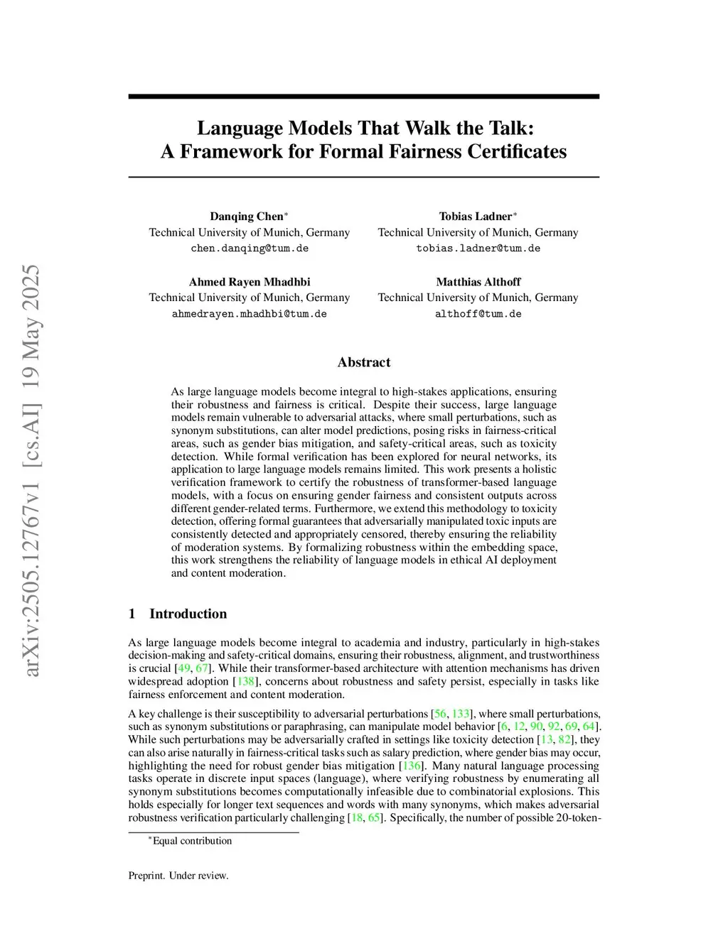 As large language models become integral to high-stakes applications, ensuring their robustness and fairness is critical. Despite their success, large language models remain vulnerable to adversarial attacks, where small perturbations, such as synonym substitutions, can alter model predictions, posing risks in fairness-critical areas, such as gender bias mitigation, and safety-critical areas, such as toxicity detection. While formal verification has been explored for neural networks, its application to large language models remains limited. This work presents a holistic verification framework to certify the robustness of transformer-based language models, with a focus on ensuring gender fairness and consistent outputs across different gender-related terms. Furthermore, we extend this methodology to toxicity detection, offering formal guarantees that adversarially manipulated toxic inputs are consistently detected and appropriately censored, thereby ensuring the reliability of moderation systems. By formalizing robustness within the embedding space, this work strengthens the reliability of language models in ethical AI deployment and content moderation.