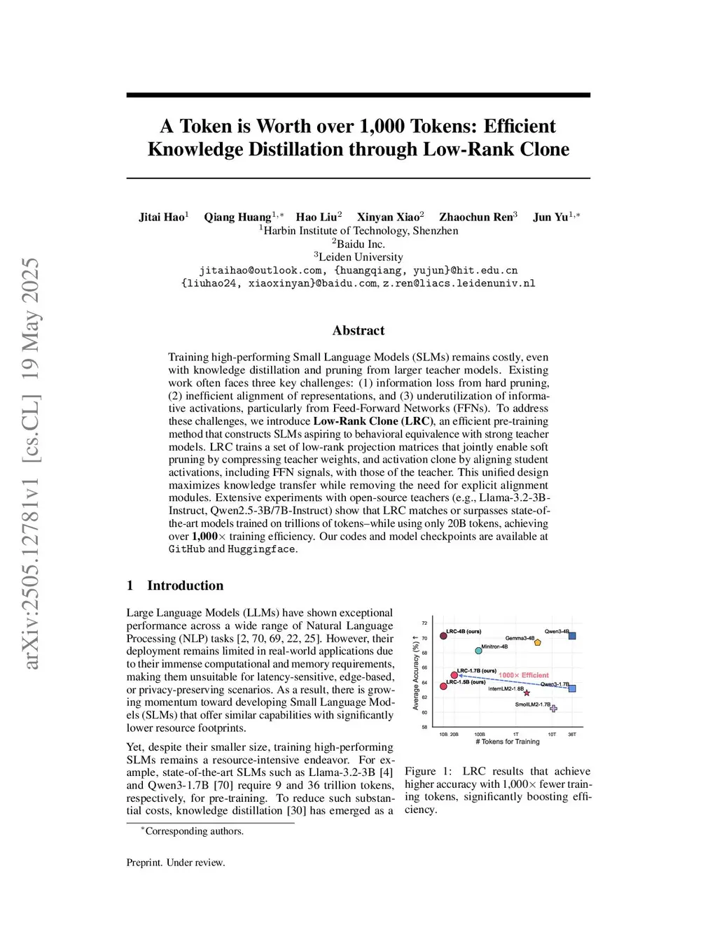 A Token is Worth over 1,000 Tokens: Efficient Knowledge Distillation through Low-Rank Clone
