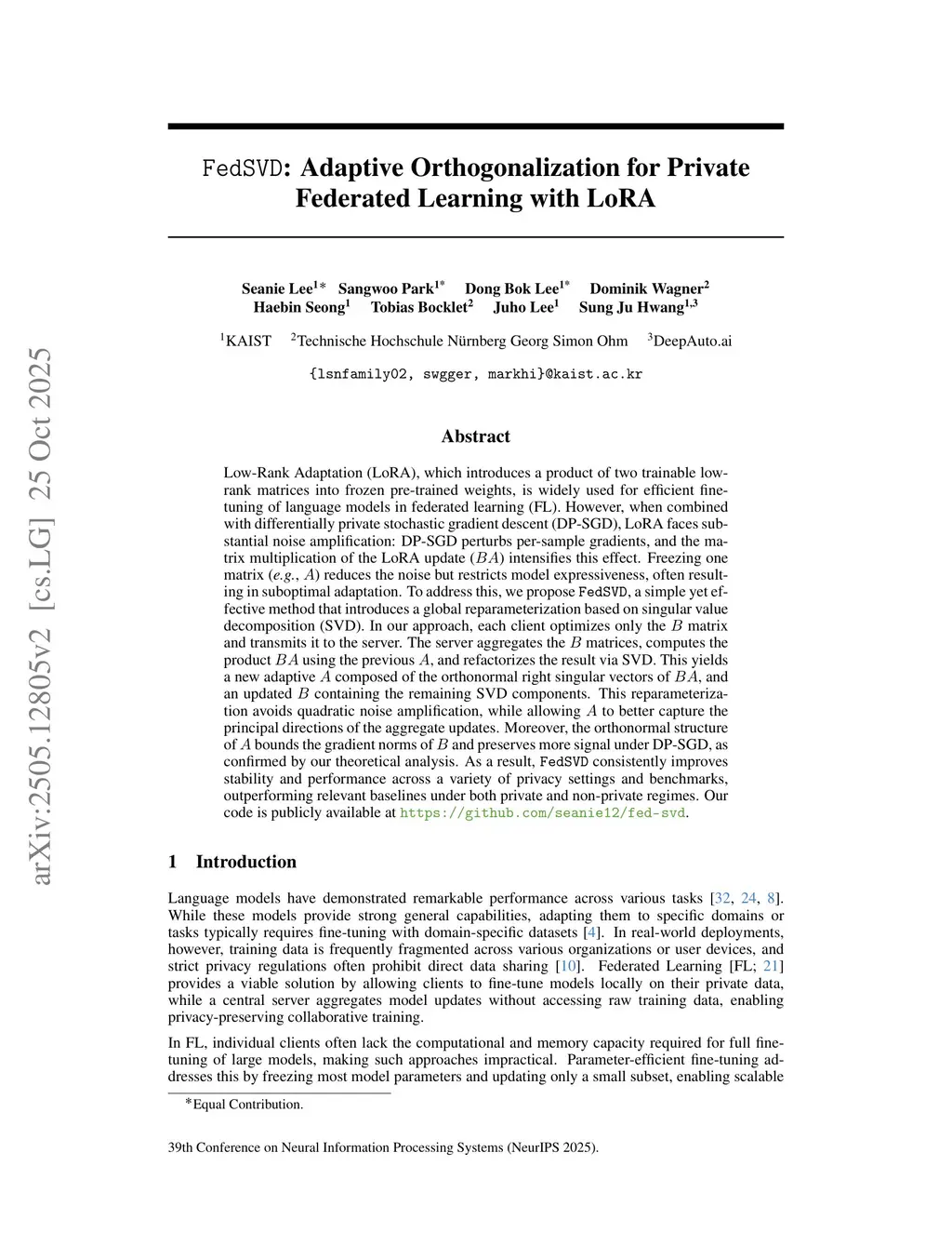 FedSVD: Adaptive Orthogonalization for Private Federated Learning with LoRA
