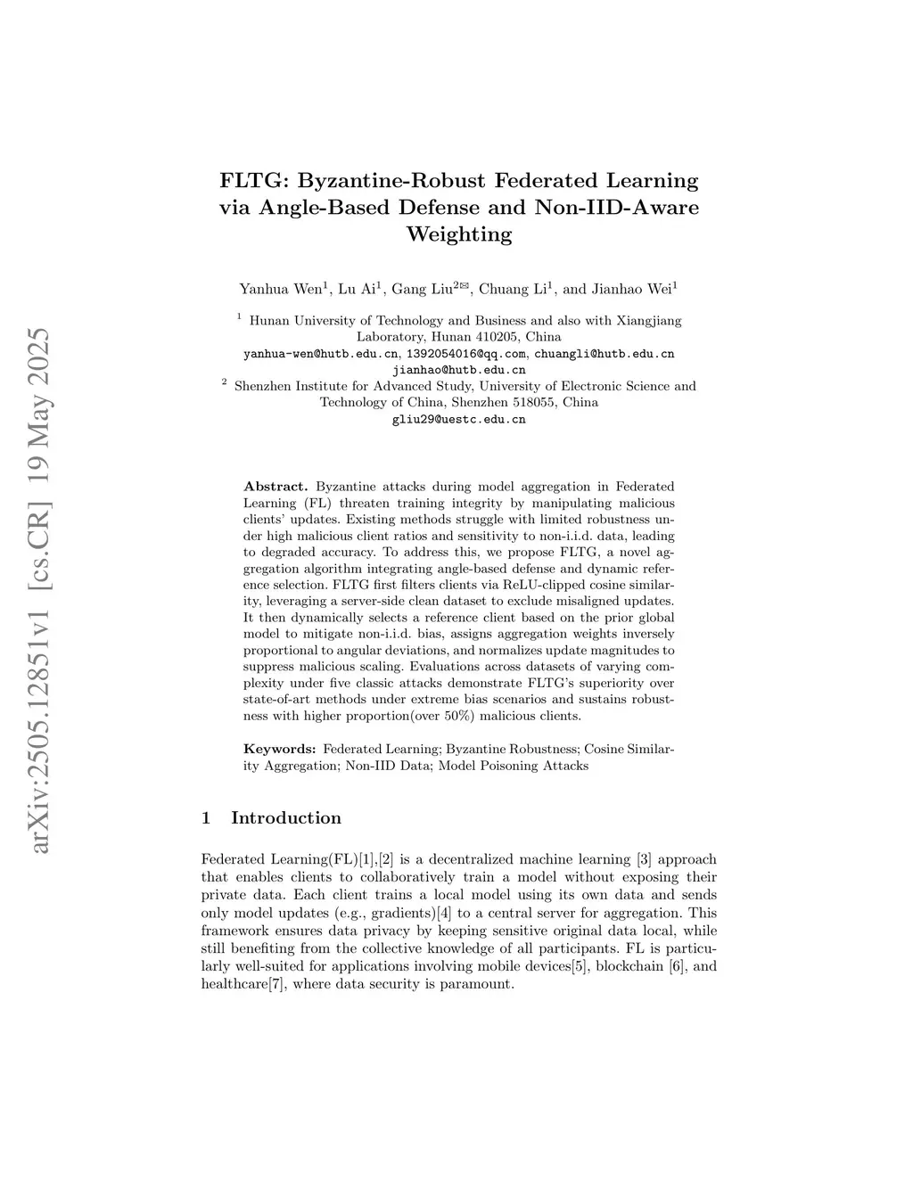 FLTG: Byzantine-Robust Federated Learning via Angle-Based Defense and Non-IID-Aware Weighting