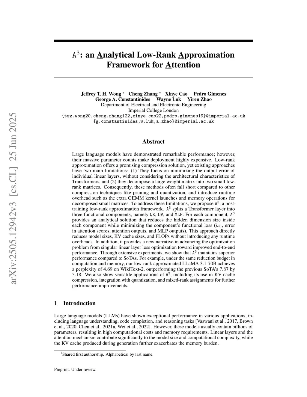 Large language models have demonstrated remarkable performance; however, their massive parameter counts make deployment highly expensive. Low-rank approximation offers a promising compression solution, yet existing approaches have two main limitations: (1) They focus on minimizing the output error of individual linear layers, without considering the architectural characteristics of Transformers, and (2) they decompose a large weight matrix into two small low-rank matrices. Consequently, these methods often fall short compared to other compression techniques like pruning and quantization, and introduce runtime overhead such as the extra GEMM kernel launches for decomposed small matrices. To address these limitations, we propose \tt A^\tt 3, a post-training low-rank approximation framework. \tt A^\tt 3 splits a Transformer layer into three functional components, namely , , and . For each component, \tt A^\tt 3 provides an analytical solution that reduces the hidden dimension size inside each component while minimizing the component's functional loss (, error in attention scores, attention outputs, and MLP outputs). This approach directly reduces model sizes, KV cache sizes, and FLOPs without introducing any runtime overheads. In addition, it provides a new narrative in advancing the optimization problem from singular linear layer loss optimization toward improved end-to-end performance. Through extensive experiments, we show that \tt A^\tt 3 maintains superior performance compared to SoTAs. For example, under the same reduction budget in computation and memory, our low-rank approximated LLaMA 3.1-70B achieves a perplexity of 4.69 on WikiText-2, outperforming the previous SoTA's 7.87 by 3.18. We also demonstrate the versatility of \tt A^\tt 3, including KV cache compression, quantization, and mixed-rank assignments for enhanced performance.