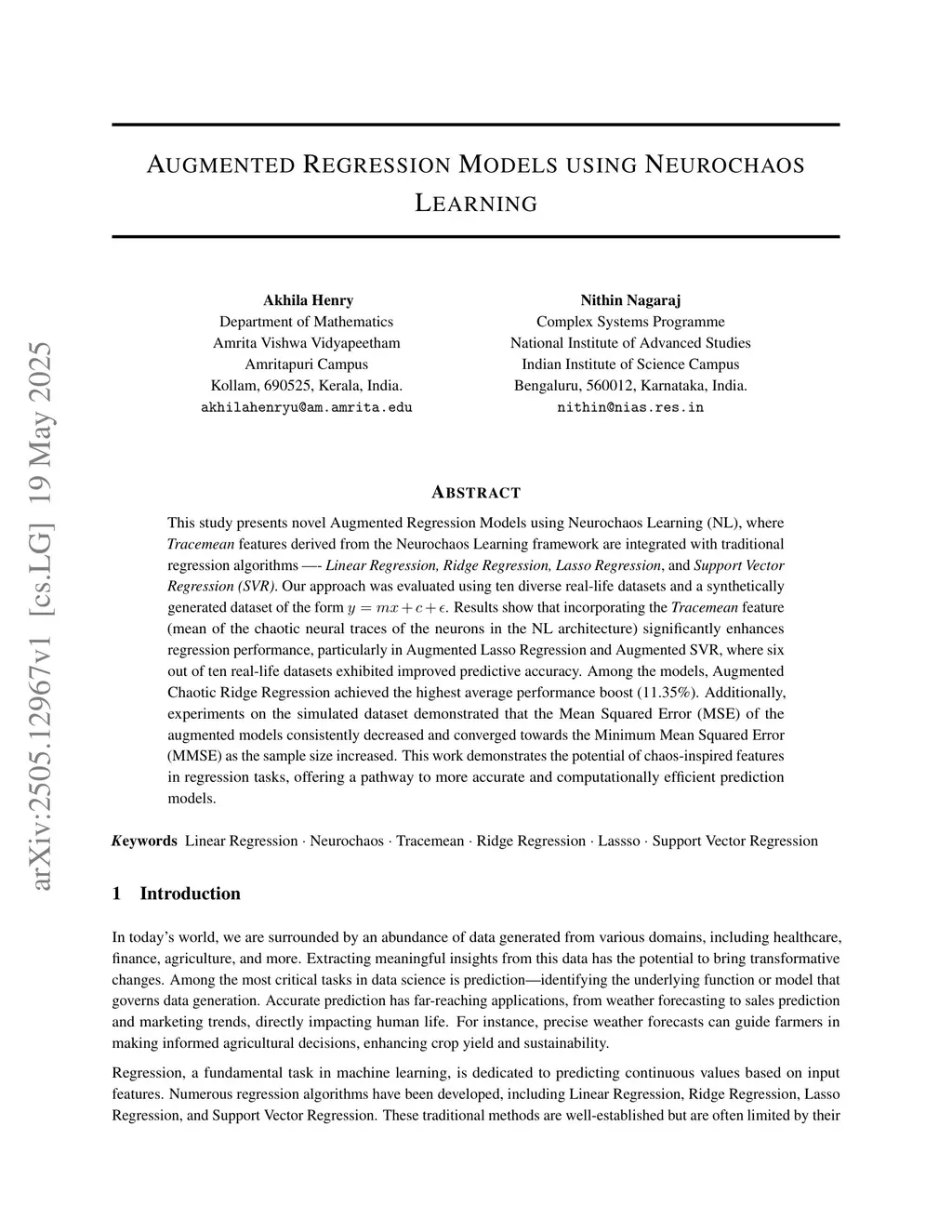 Augmented Regression Models using Neurochaos Learning