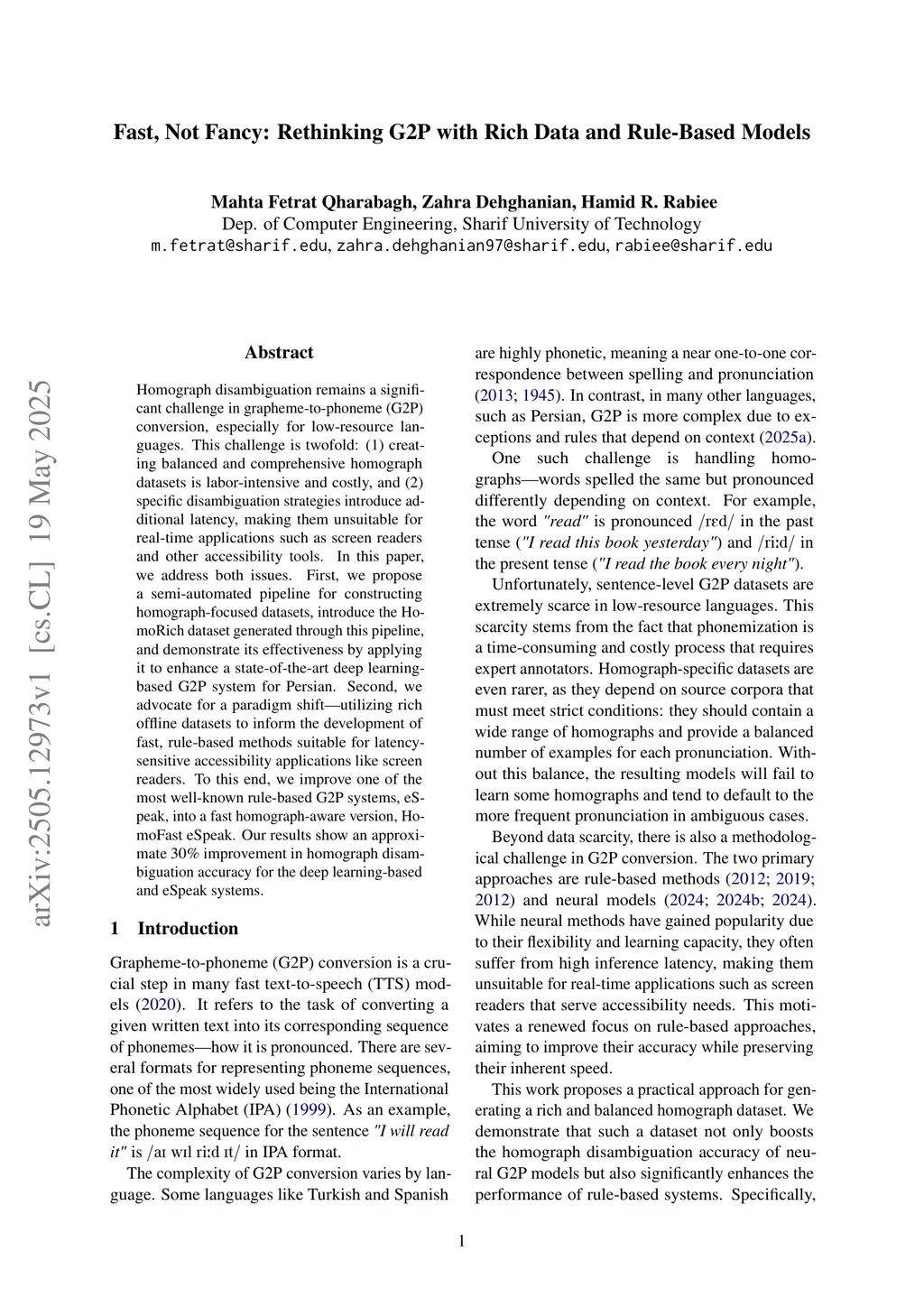 Homograph disambiguation remains a significant challenge in grapheme-to-phoneme (G2P) conversion, especially for low-resource languages. This challenge is twofold: (1) creating balanced and comprehensive homograph datasets is labor-intensive and costly, and (2) specific disambiguation strategies introduce additional latency, making them unsuitable for real-time applications such as screen readers and other accessibility tools. In this paper, we address both issues. First, we propose a semi-automated pipeline for constructing homograph-focused datasets, introduce the HomoRich dataset generated through this pipeline, and demonstrate its effectiveness by applying it to enhance a state-of-the-art deep learning-based G2P system for Persian. Second, we advocate for a paradigm shift - utilizing rich offline datasets to inform the development of fast, rule-based methods suitable for latency-sensitive accessibility applications like screen readers. To this end, we improve one of the most well-known rule-based G2P systems, eSpeak, into a fast homograph-aware version, HomoFast eSpeak. Our results show an approximate 30% improvement in homograph disambiguation accuracy for the deep learning-based and eSpeak systems.