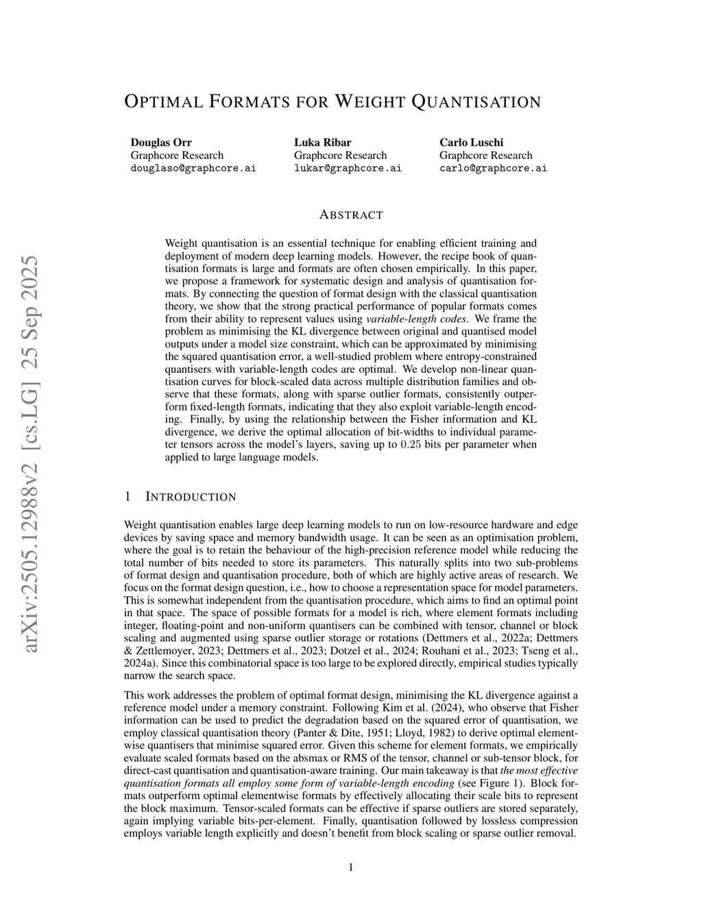 Weight quantisation is an essential technique for enabling efficient training and deployment of modern deep learning models. However, the recipe book of quantisation formats is large and formats are often chosen empirically. In this paper, we propose a framework for systematic design and analysis of quantisation formats. By connecting the question of format design with the classical quantisation theory, we show that the strong practical performance of popular formats comes from their ability to represent values using variable-length codes. We frame the problem as minimising the KL divergence between original and quantised model outputs under a model size constraint, which can be approximated by minimising the squared quantisation error, a well-studied problem where entropy-constrained quantisers with variable-length codes are optimal. We develop non-linear quantisation curves for block-scaled data across multiple distribution families and observe that these formats, along with sparse outlier formats, consistently outperform fixed-length formats, indicating that they also exploit variable-length encoding. Finally, by using the relationship between the Fisher information and KL divergence, we derive the optimal allocation of bit-widths to individual parameter tensors across the model's layers, saving up to 0.25 bits per parameter when applied to large language models.