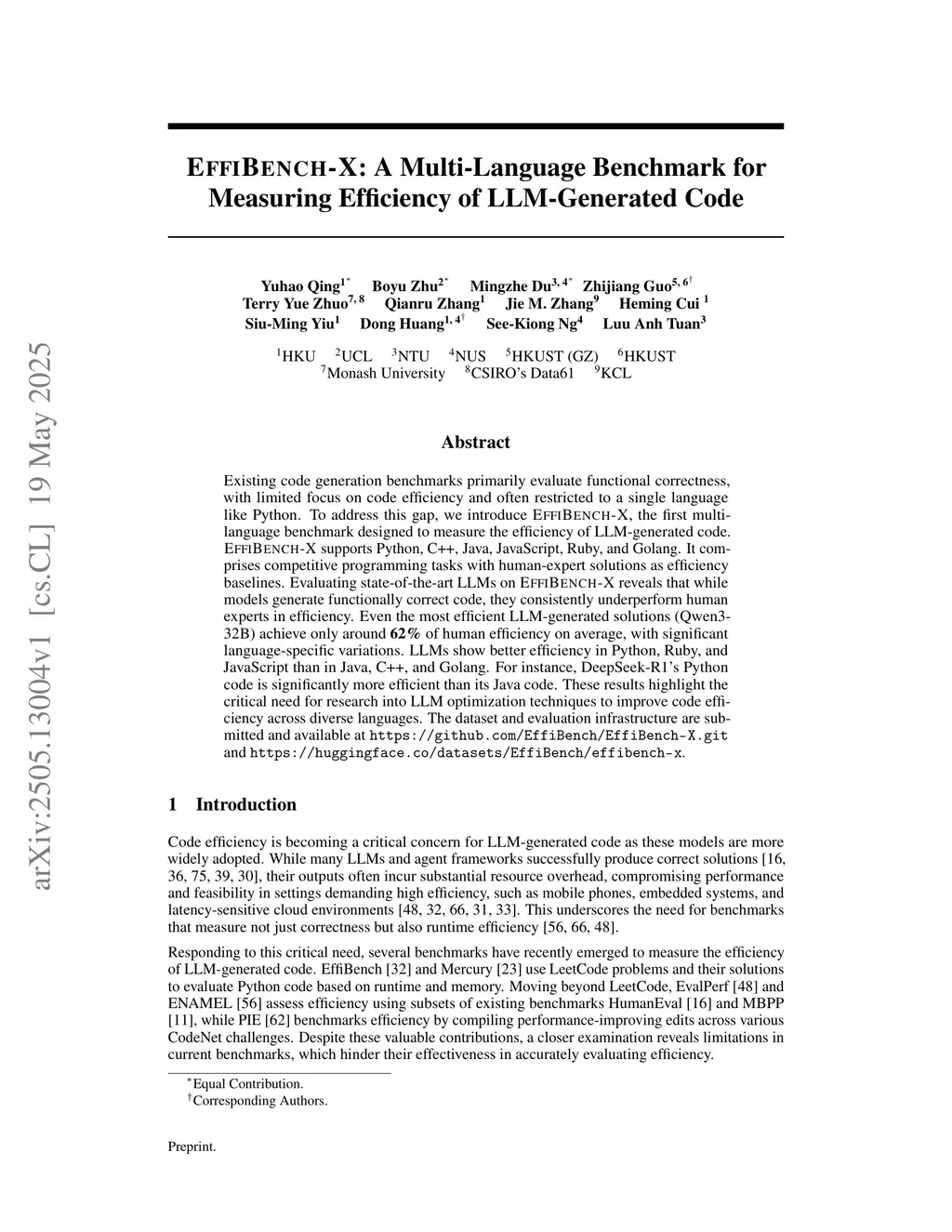 EffiBench-X: A Multi-Language Benchmark for Measuring Efficiency of LLM-Generated Code