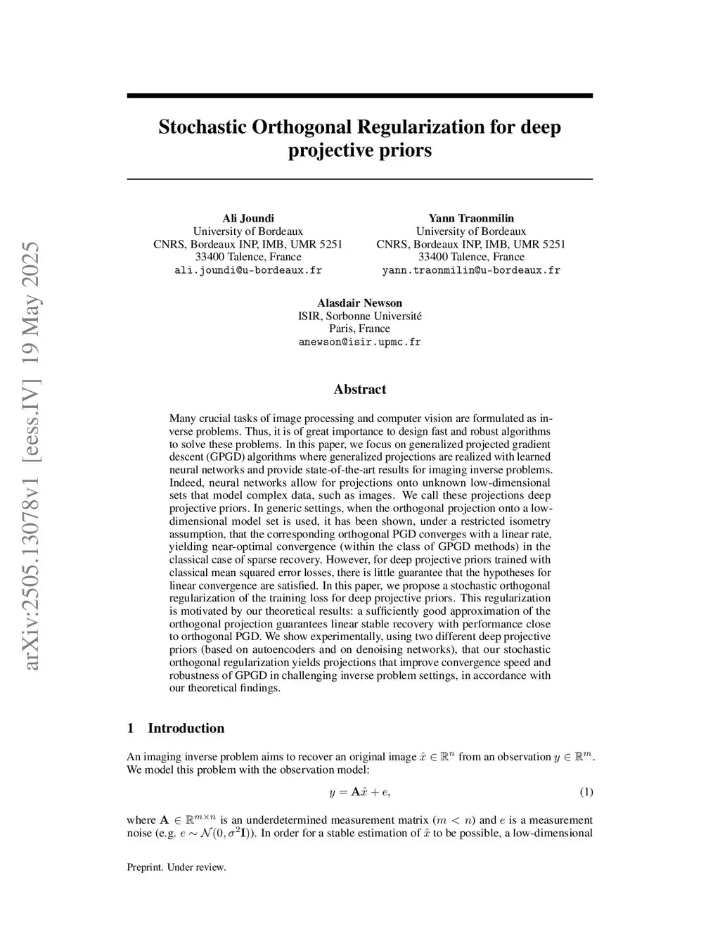 Many crucial tasks of image processing and computer vision are formulated as inverse problems. Thus, it is of great importance to design fast and robust algorithms to solve these problems. In this paper, we focus on generalized projected gradient descent (GPGD) algorithms where generalized projections are realized with learned neural networks and provide state-of-the-art results for imaging inverse problems. Indeed, neural networks allow for projections onto unknown low-dimensional sets that model complex data, such as images. We call these projections deep projective priors. In generic settings, when the orthogonal projection onto a lowdimensional model set is used, it has been shown, under a restricted isometry assumption, that the corresponding orthogonal PGD converges with a linear rate, yielding near-optimal convergence (within the class of GPGD methods) in the classical case of sparse recovery. However, for deep projective priors trained with classical mean squared error losses, there is little guarantee that the hypotheses for linear convergence are satisfied. In this paper, we propose a stochastic orthogonal regularization of the training loss for deep projective priors. This regularization is motivated by our theoretical results: a sufficiently good approximation of the orthogonal projection guarantees linear stable recovery with performance close to orthogonal PGD. We show experimentally, using two different deep projective priors (based on autoencoders and on denoising networks), that our stochastic orthogonal regularization yields projections that improve convergence speed and robustness of GPGD in challenging inverse problem settings, in accordance with our theoretical findings.