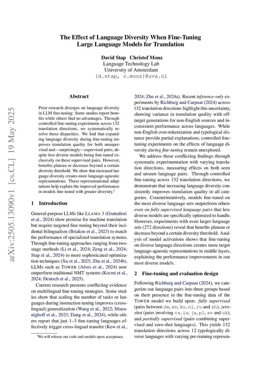 Prior research diverges on language diversity in LLM fine-tuning: Some studies report benefits while others find no advantages. Through controlled fine-tuning experiments across 132 translation directions, we systematically resolve these disparities. We find that expanding language diversity during fine-tuning improves translation quality for both unsupervised and -- surprisingly -- supervised pairs, despite less diverse models being fine-tuned exclusively on these supervised pairs. However, benefits plateau or decrease beyond a certain diversity threshold. We show that increased language diversity creates more language-agnostic representations. These representational adaptations help explain the improved performance in models fine-tuned with greater diversity.