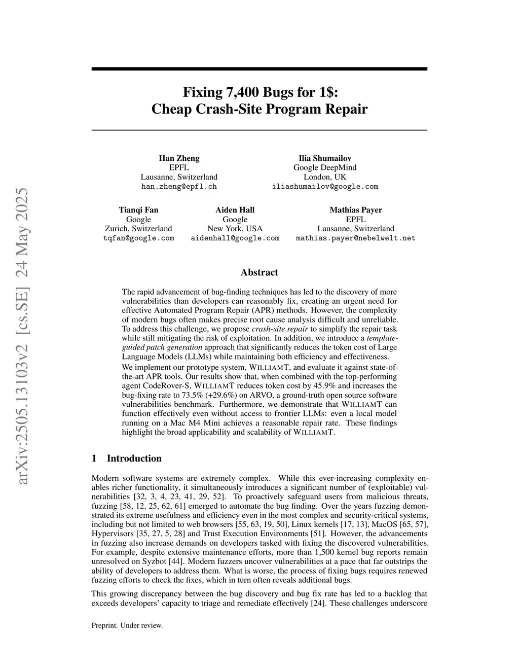 The rapid advancement of bug-finding techniques has led to the discovery of more vulnerabilities than developers can reasonably fix, creating an urgent need for effective Automated Program Repair (APR) methods. However, the complexity of modern bugs often makes precise root cause analysis difficult and unreliable. To address this challenge, we propose crash-site repair to simplify the repair task while still mitigating the risk of exploitation. In addition, we introduce a template-guided patch generation approach that significantly reduces the token cost of Large Language Models (LLMs) while maintaining both efficiency and effectiveness.We implement our prototype system, WILLIAMT, and evaluate it against state-of-the-art APR tools. Our results show that, when combined with the top-performing agent CodeRover-S, WILLIAMT reduces token cost by 45.9% and increases the bug-fixing rate to 73.5% (+29.6%) on ARVO, a ground-truth open source software vulnerabilities benchmark. Furthermore, we demonstrate that WILLIAMT can function effectively even without access to frontier LLMs: even a local model running on a Mac M4 Mini achieves a reasonable repair rate. These findings highlight the broad applicability and scalability of WILLIAMT.