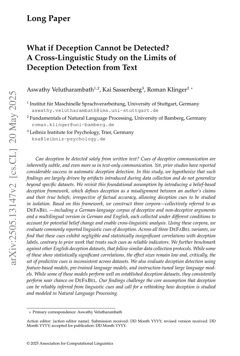 Can deception be detected solely from written text? Cues of deceptive communication are inherently subtle, even more so in text-only communication. Yet, prior studies have reported considerable success in automatic deception detection. We hypothesize that such findings are largely driven by artifacts introduced during data collection and do not generalize beyond specific datasets. We revisit this assumption by introducing a belief-based deception framework, which defines deception as a misalignment between an author's claims and true beliefs, irrespective of factual accuracy, allowing deception cues to be studied in isolation. Based on this framework, we construct three corpora, collectively referred to as DeFaBel, including a German-language corpus of deceptive and non-deceptive arguments and a multilingual version in German and English, each collected under varying conditions to account for belief change and enable cross-linguistic analysis. Using these corpora, we evaluate commonly reported linguistic cues of deception. Across all three DeFaBel variants, these cues show negligible, statistically insignificant correlations with deception labels, contrary to prior work that treats such cues as reliable indicators. We further benchmark against other English deception datasets following similar data collection protocols. While some show statistically significant correlations, effect sizes remain low and, critically, the set of predictive cues is inconsistent across datasets. We also evaluate deception detection using feature-based models, pretrained language models, and instruction-tuned large language models. While some models perform well on established deception datasets, they consistently perform near chance on DeFaBel. Our findings challenge the assumption that deception can be reliably inferred from linguistic cues and call for rethinking how deception is studied and modeled in NLP.