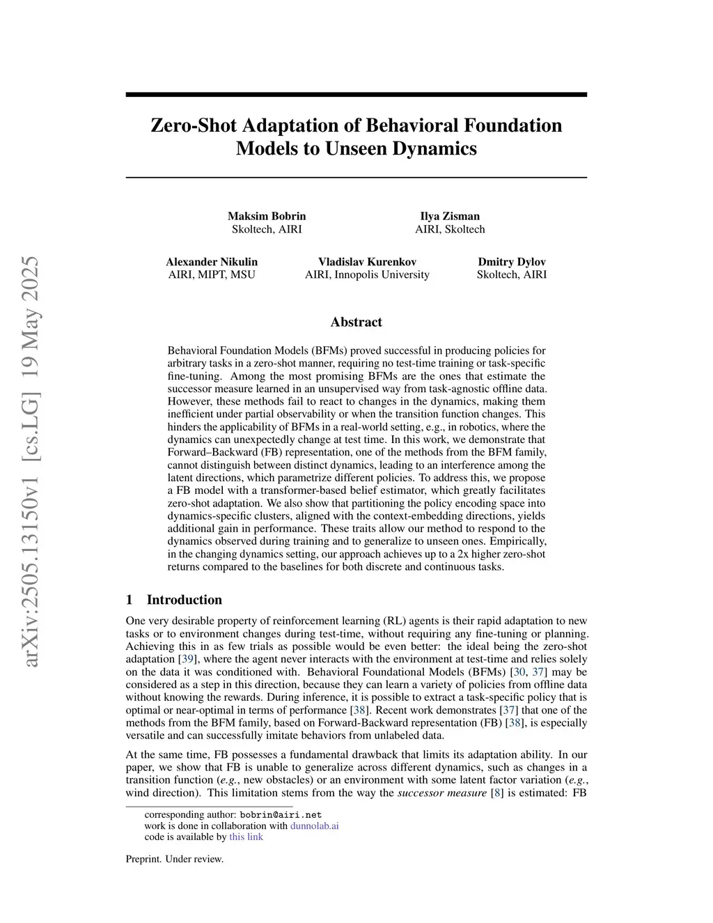 Behavioral Foundation Models (BFMs) proved successful in producing policies for arbitrary tasks in a zero-shot manner, requiring no test-time training or task-specific fine-tuning. Among the most promising BFMs are the ones that estimate the successor measure learned in an unsupervised way from task-agnostic offline data. However, these methods fail to react to changes in the dynamics, making them inefficient under partial observability or when the transition function changes. This hinders the applicability of BFMs in a real-world setting, e.g., in robotics, where the dynamics can unexpectedly change at test time. In this work, we demonstrate that Forward-Backward (FB) representation, one of the methods from the BFM family, cannot distinguish between distinct dynamics, leading to an interference among the latent directions, which parametrize different policies. To address this, we propose a FB model with a transformer-based belief estimator, which greatly facilitates zero-shot adaptation. We also show that partitioning the policy encoding space into dynamics-specific clusters, aligned with the context-embedding directions, yields additional gain in performance. These traits allow our method to respond to the dynamics observed during training and to generalize to unseen ones. Empirically, in the changing dynamics setting, our approach achieves up to a 2x higher zero-shot returns compared to the baselines for both discrete and continuous tasks.
