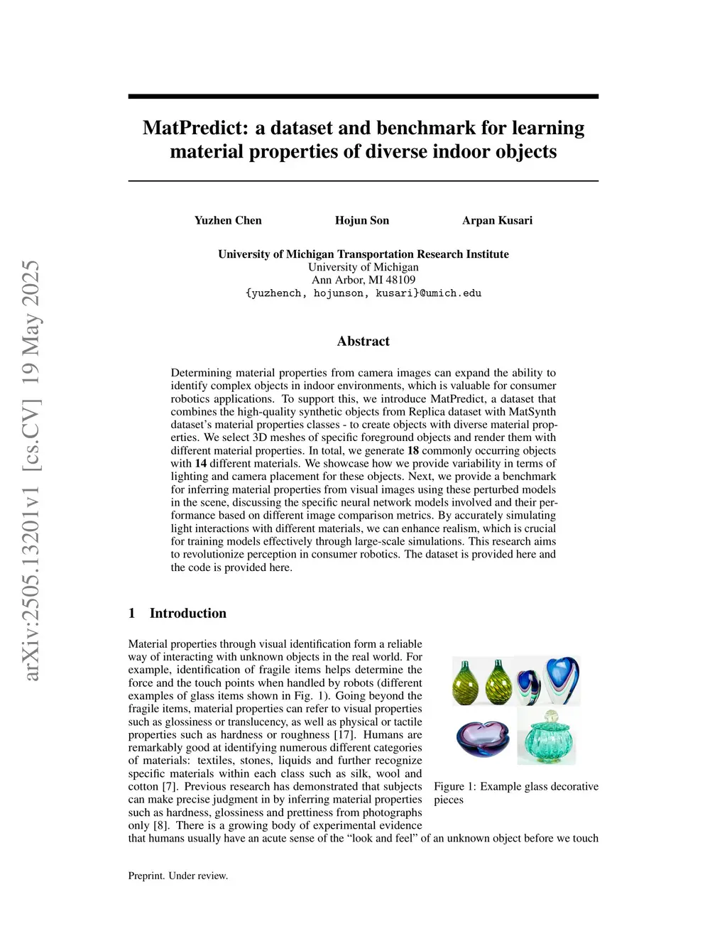 Determining material properties from camera images can expand the ability to identify complex objects in indoor environments, which is valuable for consumer robotics applications. To support this, we introduce MatPredict, a dataset that combines the high-quality synthetic objects from Replica dataset with MatSynth dataset's material properties classes - to create objects with diverse material properties. We select 3D meshes of specific foreground objects and render them with different material properties. In total, we generate \textbf{18} commonly occurring objects with \textbf{14} different materials. We showcase how we provide variability in terms of lighting and camera placement for these objects. Next, we provide a benchmark for inferring material properties from visual images using these perturbed models in the scene, discussing the specific neural network models involved and their performance based on different image comparison metrics. By accurately simulating light interactions with different materials, we can enhance realism, which is crucial for training models effectively through large-scale simulations. This research aims to revolutionize perception in consumer robotics. The dataset is provided \href{this https URL}{here} and the code is provided \href{this https URL}{here}.