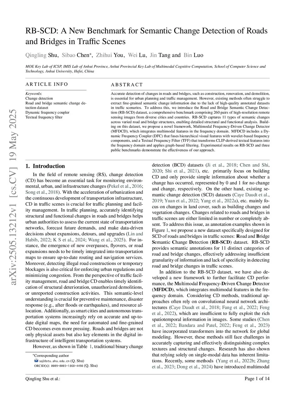 Accurate detection of road and bridge changes is crucial for urban planning and transportation management, yet presents unique challenges for general change detection (CD). Key difficulties arise from maintaining the continuity of roads and bridges as linear structures and disambiguating visually similar land covers (e.g., road construction vs. bare land). Existing spatial-domain models struggle with these issues, further hindered by the lack of specialized, semantically rich datasets. To fill these gaps, we introduce the Road and Bridge Semantic Change Detection (RB-SCD) dataset. As the first benchmark to systematically target semantic change detection of roads and bridges, RB-SCD offers comprehensive fine-grained annotations for 11 semantic change categories. This enables a detailed analysis of traffic infrastructure evolution. Building on this, we propose a novel framework, the Multimodal Frequency-Driven Change Detector (MFDCD). MFDCD integrates multimodal features in the frequency domain through two key components: (1) the Dynamic Frequency Coupler (DFC), which leverages wavelet transform to decompose visual features, enabling it to robustly model the continuity of linear transitions; and (2) the Textual Frequency Filter (TFF), which encodes semantic priors into frequency-domain graphs and applies filter banks to align them with visual features, resolving semantic ambiguities. Experiments demonstrate the state-of-the-art performance of MFDCD on RB-SCD and three public CD datasets. The code will be available atthis https URL.