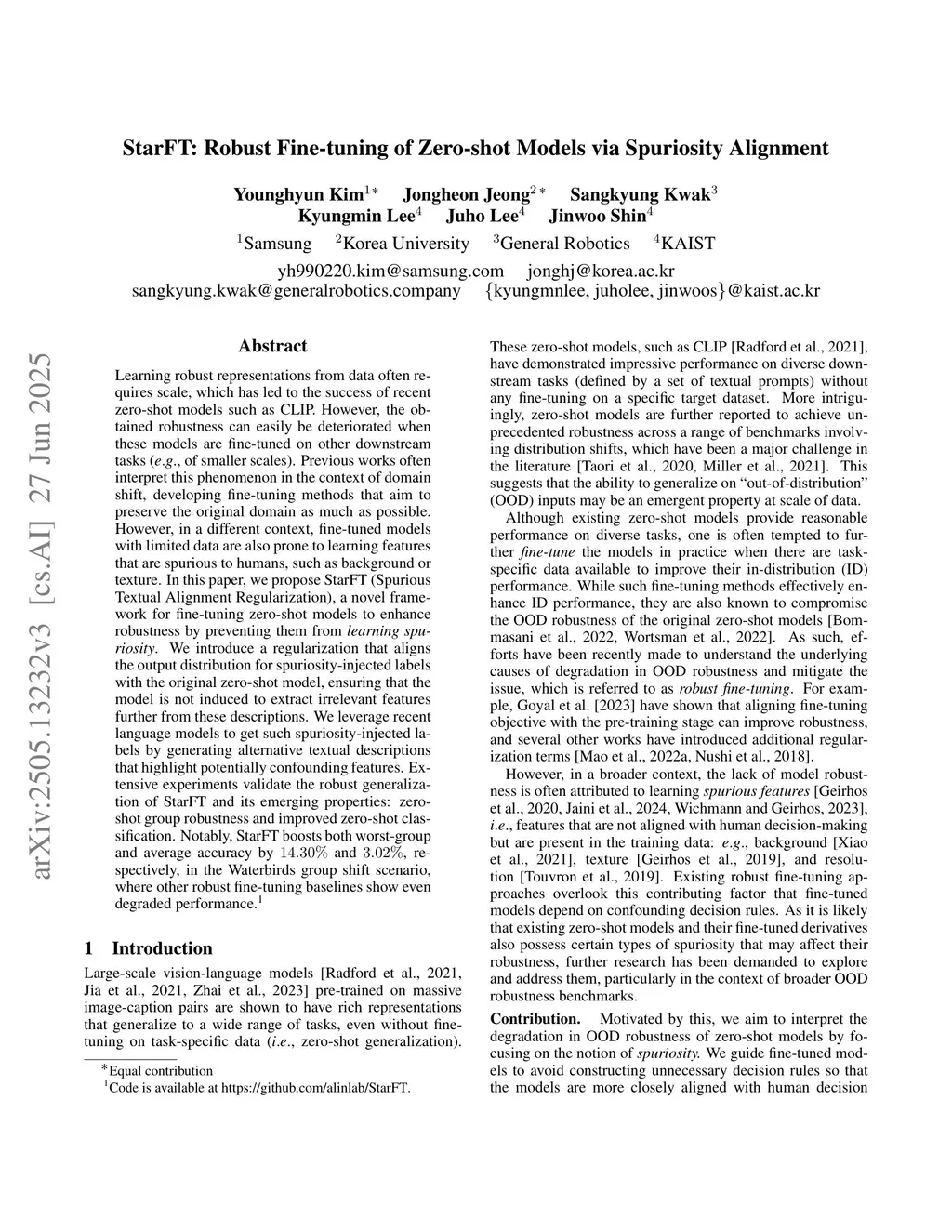 StarFT: Robust Fine-tuning of Zero-shot Models via Spuriosity Alignment