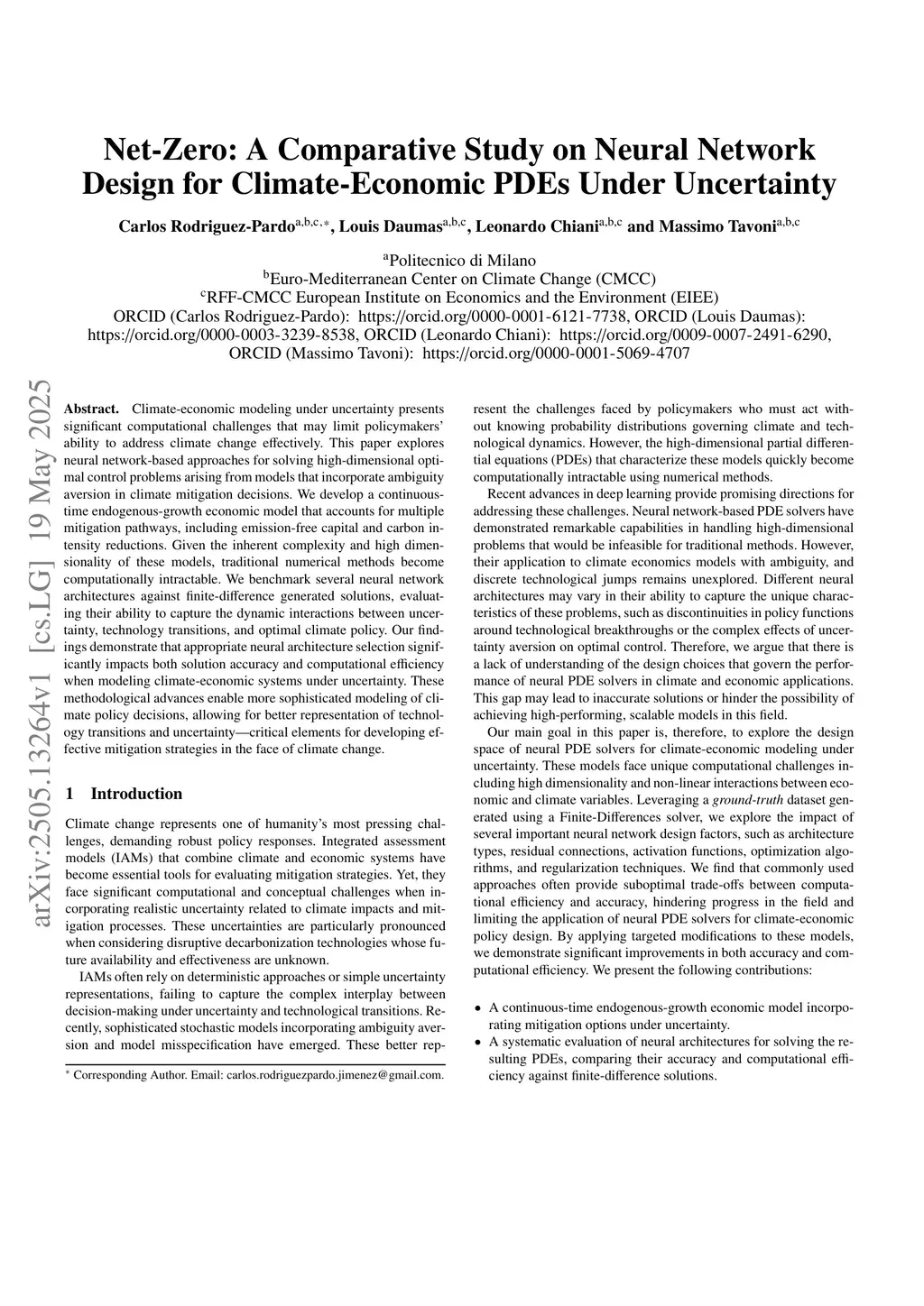 Climate-economic modeling under uncertainty presents significant computational challenges that may limit policymakers' ability to address climate change effectively. This paper explores neural network-based approaches for solving high-dimensional optimal control problems arising from models that incorporate ambiguity aversion in climate mitigation decisions. We develop a continuous-time endogenous-growth economic model that accounts for multiple mitigation pathways, including emission-free capital and carbon intensity reductions. Given the inherent complexity and high dimensionality of these models, traditional numerical methods become computationally intractable. We benchmark several neural network architectures against finite-difference generated solutions, evaluating their ability to capture the dynamic interactions between uncertainty, technology transitions, and optimal climate policy. Our findings demonstrate that appropriate neural architecture selection significantly impacts both solution accuracy and computational efficiency when modeling climate-economic systems under uncertainty. These methodological advances enable more sophisticated modeling of climate policy decisions, allowing for better representation of technology transitions and uncertainty-critical elements for developing effective mitigation strategies in the face of climate change.