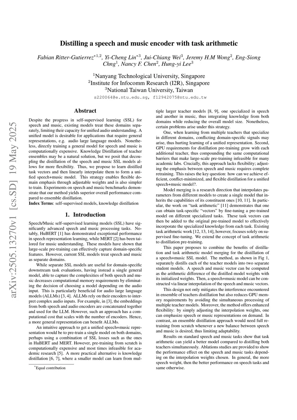 Despite the progress in self-supervised learning (SSL) for speech and music, existing models treat these domains separately, limiting their capacity for unified audio understanding. A unified model is desirable for applications that require general representations, e.g. audio large language models. Nonetheless, directly training a general model for speech and music is computationally expensive. Knowledge Distillation of teacher ensembles may be a natural solution, but we posit that decoupling the distillation of the speech and music SSL models allows for more flexibility. Thus, we propose to learn distilled task vectors and then linearly interpolate them to form a unified speech+music model. This strategy enables flexible domain emphasis through adjustable weights and is also simpler to train. Experiments on speech and music benchmarks demonstrate that our method yields superior overall performance compared to ensemble distillation.