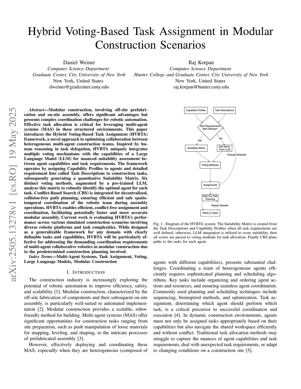 Modular construction, involving off-site prefabrication and on-site assembly, offers significant advantages but presents complex coordination challenges for robotic automation. Effective task allocation is critical for leveraging multi-agent systems (MAS) in these structured environments. This paper introduces the Hybrid Voting-Based Task Assignment (HVBTA) framework, a novel approach to optimizing collaboration between heterogeneous multi-agent construction teams. Inspired by human reasoning in task delegation, HVBTA uniquely integrates multiple voting mechanisms with the capabilities of a Large Language Model (LLM) for nuanced suitability assessment between agent capabilities and task requirements. The framework operates by assigning Capability Profiles to agents and detailed requirement lists called Task Descriptions to construction tasks, subsequently generating a quantitative Suitability Matrix. Six distinct voting methods, augmented by a pre-trained LLM, analyze this matrix to robustly identify the optimal agent for each task. Conflict-Based Search (CBS) is integrated for decentralized, collision-free path planning, ensuring efficient and safe spatio-temporal coordination of the robotic team during assembly operations. HVBTA enables efficient, conflict-free assignment and coordination, facilitating potentially faster and more accurate modular assembly. Current work is evaluating HVBTA's performance across various simulated construction scenarios involving diverse robotic platforms and task complexities. While designed as a generalizable framework for any domain with clearly definable tasks and capabilities, HVBTA will be particularly effective for addressing the demanding coordination requirements of multi-agent collaborative robotics in modular construction due to the predetermined construction planning involved.