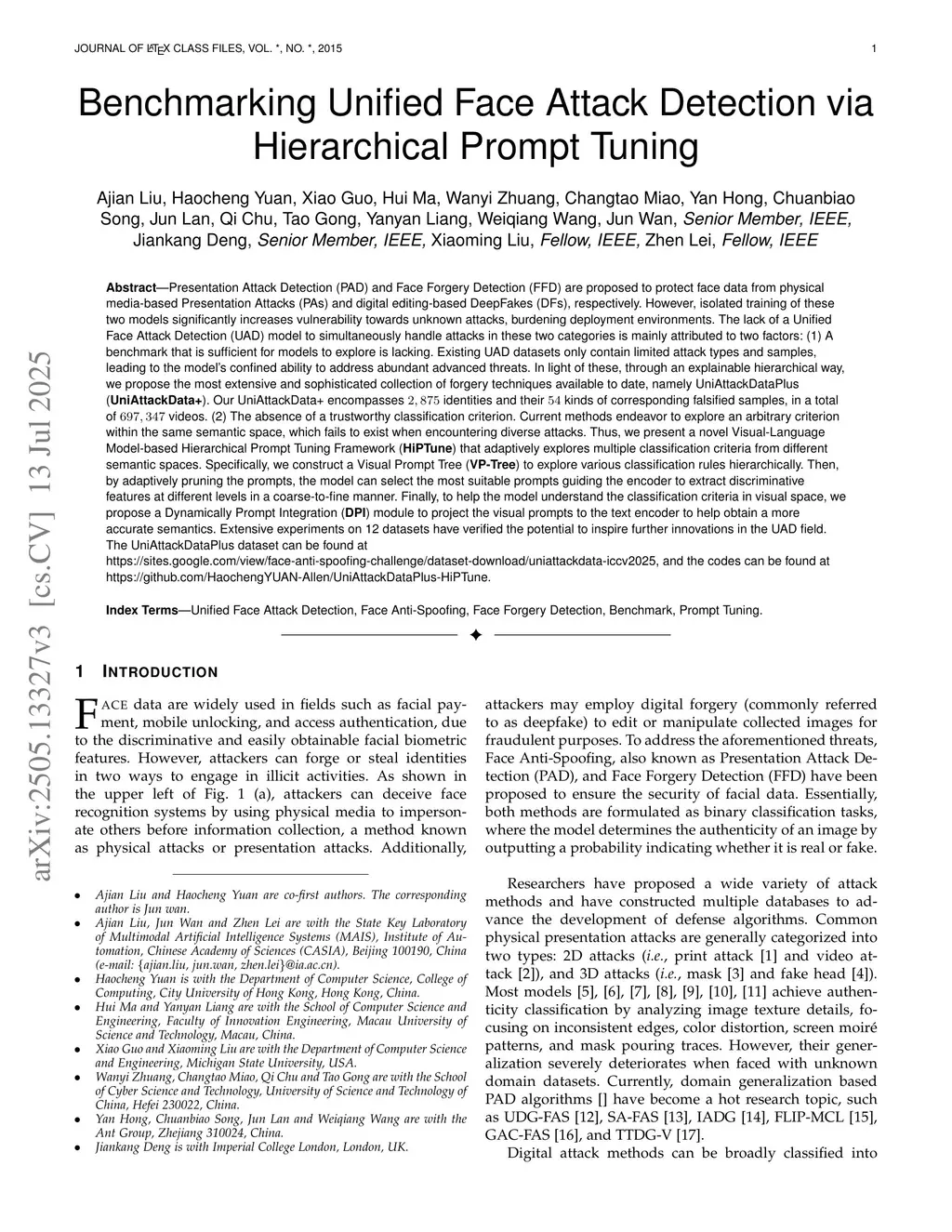PAD and FFD are proposed to protect face data from physical media-based Presentation Attacks and digital editing-based DeepFakes, respectively. However, isolated training of these two models significantly increases vulnerability towards unknown attacks, burdening deployment environments. The lack of a Unified Face Attack Detection model to simultaneously handle attacks in these two categories is mainly attributed to two factors: (1) A benchmark that is sufficient for models to explore is lacking. Existing UAD datasets only contain limited attack types and samples, leading to the model's confined ability to address abundant advanced threats. In light of these, through an explainable hierarchical way, we propose the most extensive and sophisticated collection of forgery techniques available to date, namely UniAttackDataPlus. Our UniAttackData+ encompasses 2,875 identities and their 54 kinds of corresponding falsified samples, in a total of 697,347 videos. (2) The absence of a trustworthy classification criterion. Current methods endeavor to explore an arbitrary criterion within the same semantic space, which fails to exist when encountering diverse attacks. Thus, we present a novel Visual-Language Model-based Hierarchical Prompt Tuning Framework that adaptively explores multiple classification criteria from different semantic spaces. Specifically, we construct a VP-Tree to explore various classification rules hierarchically. Then, by adaptively pruning the prompts, the model can select the most suitable prompts guiding the encoder to extract discriminative features at different levels in a coarse-to-fine manner. Finally, to help the model understand the classification criteria in visual space, we propose a DPI module to project the visual prompts to the text encoder to help obtain a more accurate semantics.