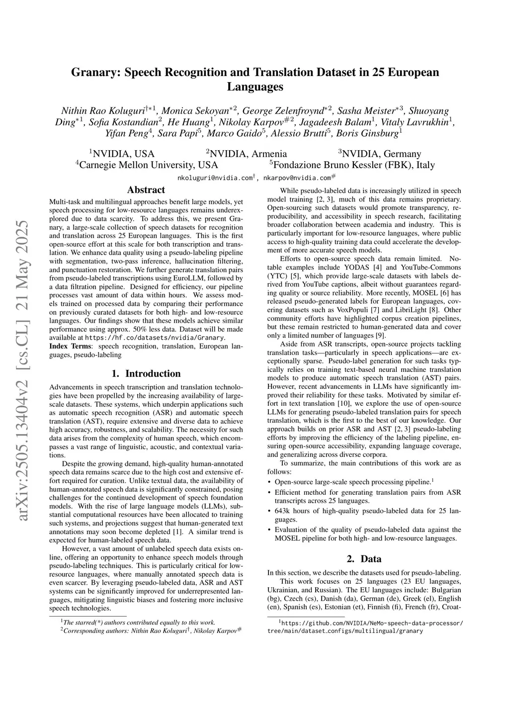 Multi-task and multilingual approaches benefit large models, yet speech processing for low-resource languages remains underexplored due to data scarcity. To address this, we present Granary, a large-scale collection of speech datasets for recognition and translation across 25 European languages. This is the first open-source effort at this scale for both transcription and translation. We enhance data quality using a pseudo-labeling pipeline with segmentation, two-pass inference, hallucination filtering, and punctuation restoration. We further generate translation pairs from pseudo-labeled transcriptions using EuroLLM, followed by a data filtration pipeline. Designed for efficiency, our pipeline processes vast amount of data within hours. We assess models trained on processed data by comparing their performance on previously curated datasets for both high- and low-resource languages. Our findings show that these models achieve similar performance using approx. 50% less data. Dataset will be made available atthis https URL