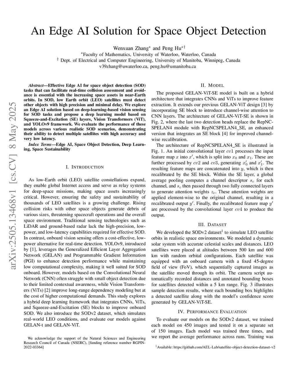 Effective Edge AI for space object detection (SOD) tasks that can facilitate real-time collision assessment and avoidance is essential with the increasing space assets in near-Earth orbits. In SOD, low Earth orbit (LEO) satellites must detect other objects with high precision and minimal delay. We explore an Edge AI solution based on deep-learning-based vision sensing for SOD tasks and propose a deep learning model based on Squeeze-and-Excitation (SE) layers, Vision Transformers (ViT), and YOLOv9 framework. We evaluate the performance of these models across various realistic SOD scenarios, demonstrating their ability to detect multiple satellites with high accuracy and very low latency.
