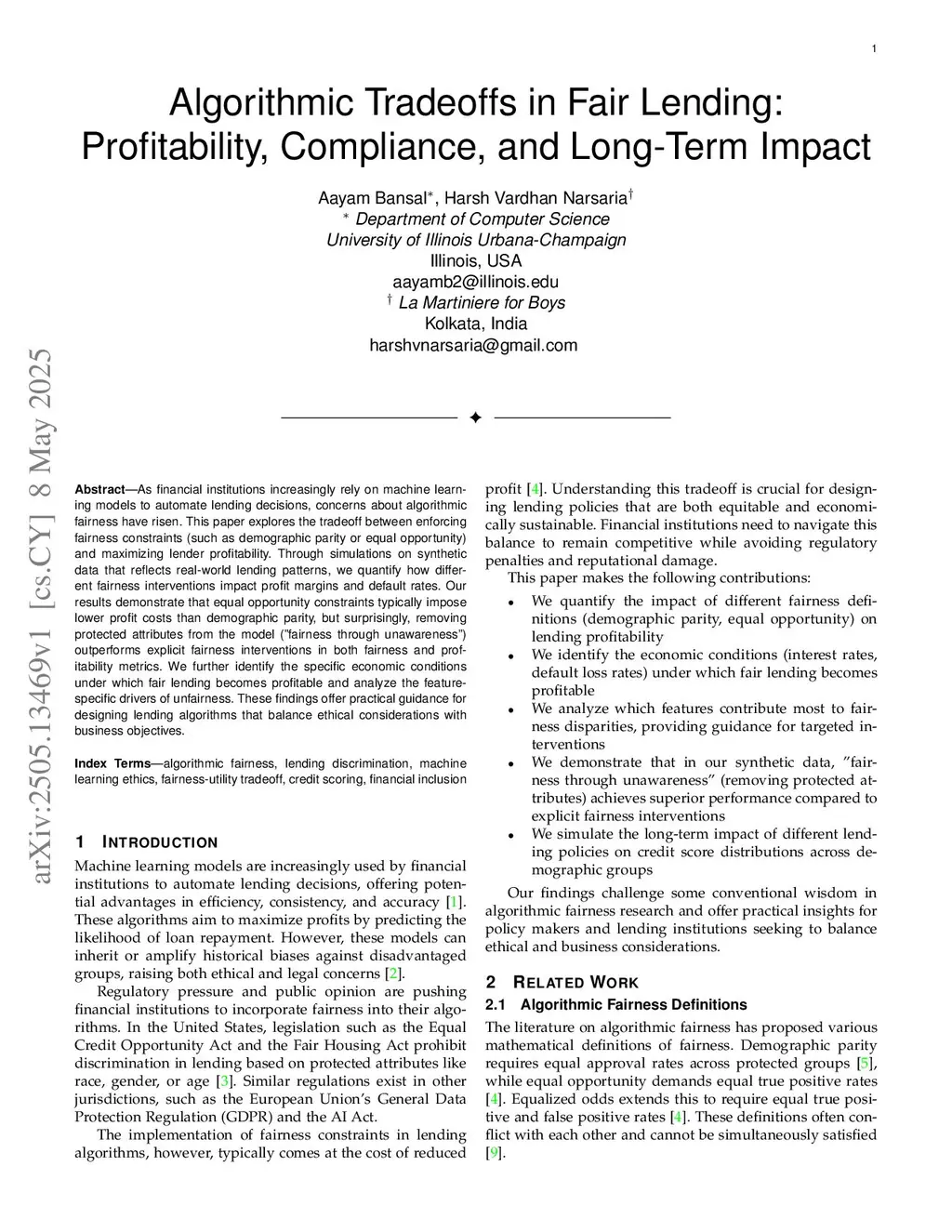 As financial institutions increasingly rely on machine learning models to automate lending decisions, concerns about algorithmic fairness have risen. This paper explores the tradeoff between enforcing fairness constraints (such as demographic parity or equal opportunity) and maximizing lender profitability. Through simulations on synthetic data that reflects real-world lending patterns, we quantify how different fairness interventions impact profit margins and default rates. Our results demonstrate that equal opportunity constraints typically impose lower profit costs than demographic parity, but surprisingly, removing protected attributes from the model (fairness through unawareness) outperforms explicit fairness interventions in both fairness and profitability metrics. We further identify the specific economic conditions under which fair lending becomes profitable and analyze the feature-specific drivers of unfairness. These findings offer practical guidance for designing lending algorithms that balance ethical considerations with business objectives.