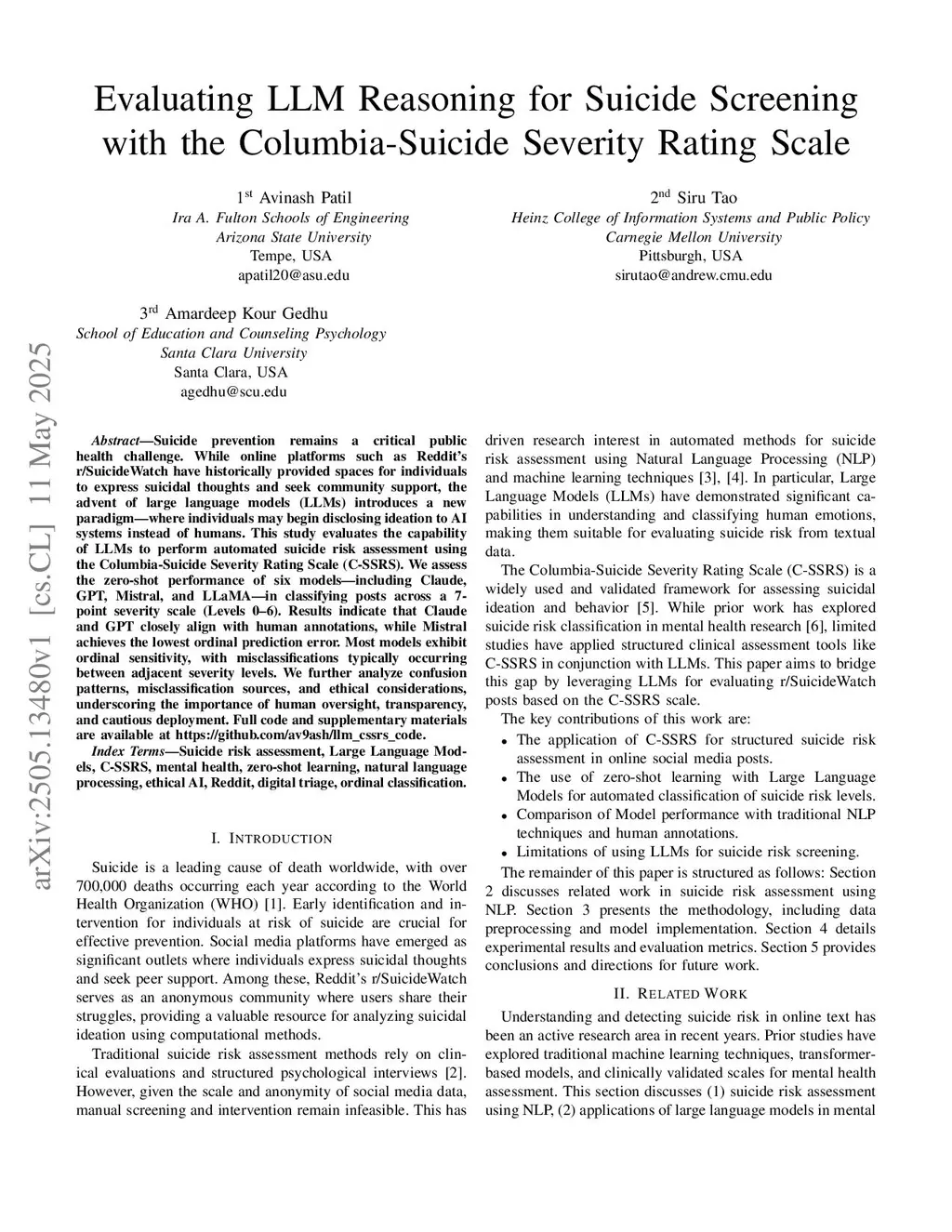 Suicide prevention remains a critical public health challenge. While online platforms such as Reddit's r/SuicideWatch have historically provided spaces for individuals to express suicidal thoughts and seek community support, the advent of large language models (LLMs) introduces a new paradigm-where individuals may begin disclosing ideation to AI systems instead of humans. This study evaluates the capability of LLMs to perform automated suicide risk assessment using the Columbia-Suicide Severity Rating Scale (C-SSRS). We assess the zero-shot performance of six models-including Claude, GPT, Mistral, and LLaMA-in classifying posts across a 7-point severity scale (Levels 0-6). Results indicate that Claude and GPT closely align with human annotations, while Mistral achieves the lowest ordinal prediction error. Most models exhibit ordinal sensitivity, with misclassifications typically occurring between adjacent severity levels. We further analyze confusion patterns, misclassification sources, and ethical considerations, underscoring the importance of human oversight, transparency, and cautious deployment. Full code and supplementary materials are available atthis https URL.