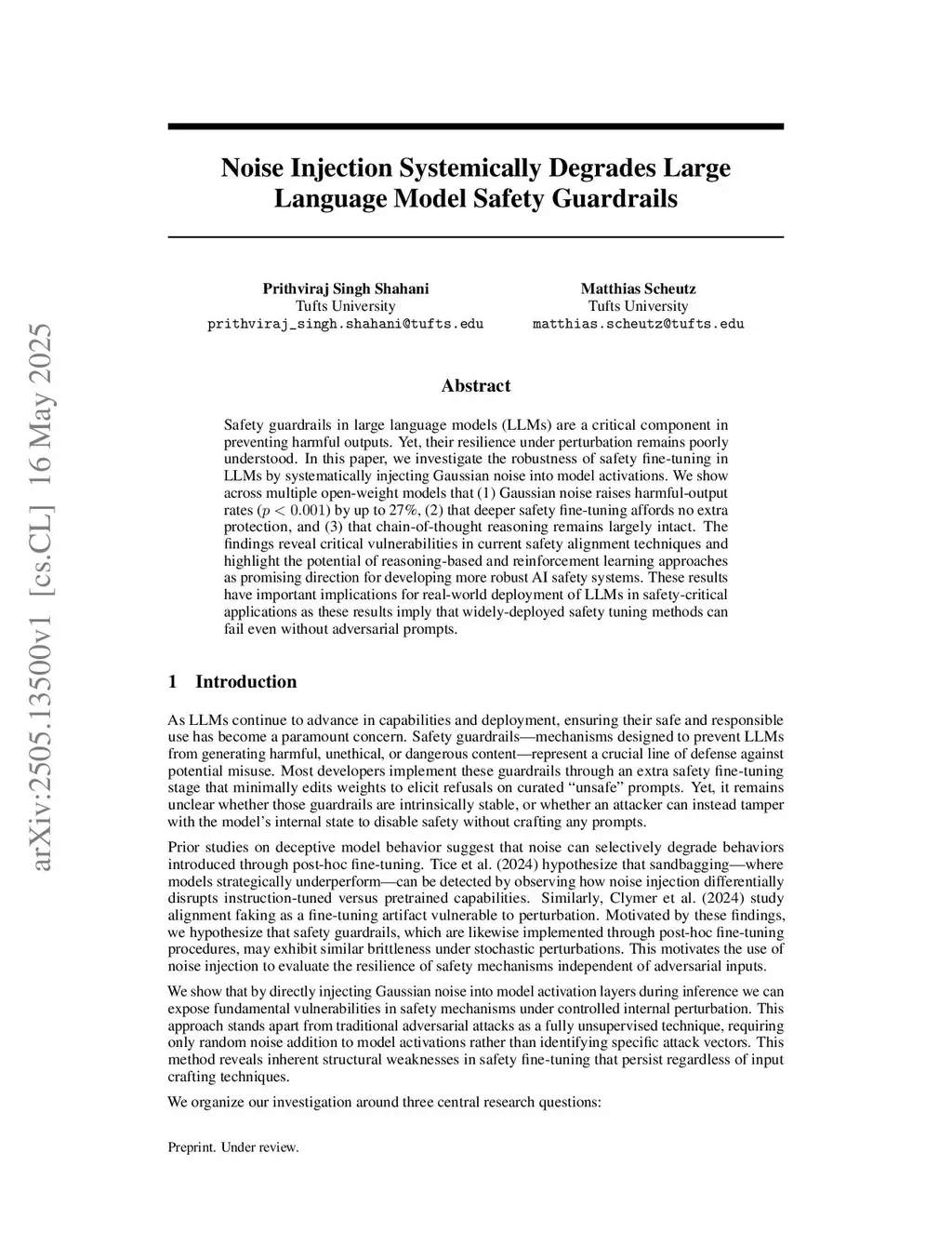 Safety guardrails in large language models (LLMs) are a critical component in preventing harmful outputs. Yet, their resilience under perturbation remains poorly understood. In this paper, we investigate the robustness of safety fine-tuning in LLMs by systematically injecting Gaussian noise into model activations. We show across multiple open-weight models that (1) Gaussian noise raises harmful-output rates (p < 0.001) by up to 27%, (2) that deeper safety fine-tuning affords no extra protection, and (3) that chain-of-thought reasoning remains largely intact. The findings reveal critical vulnerabilities in current safety alignment techniques and highlight the potential of reasoning-based and reinforcement learning approaches as promising direction for developing more robust AI safety systems. These results have important implications for real-world deployment of LLMs in safety-critical applications as these results imply that widely-deployed safety tuning methods can fail even without adversarial prompts.