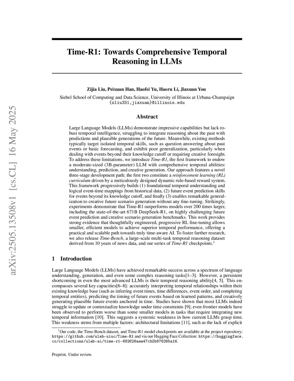 Large Language Models (LLMs) demonstrate impressive capabilities but lack robust temporal intelligence, struggling to integrate reasoning about the past with predictions and plausible generations of the future. Meanwhile, existing methods typically target isolated temporal skills, such as question answering about past events or basic forecasting, and exhibit poor generalization, particularly when dealing with events beyond their knowledge cutoff or requiring creative foresight. To address these limitations, we introduce \textit{Time-R1}, the first framework to endow a moderate-sized (3B-parameter) LLM with comprehensive temporal abilities: understanding, prediction, and creative generation. Our approach features a novel three-stage development path; the first two constitute a \textit{reinforcement learning (RL) curriculum} driven by a meticulously designed dynamic rule-based reward system. This framework progressively builds (1) foundational temporal understanding and logical event-time mappings from historical data, (2) future event prediction skills for events beyond its knowledge cutoff, and finally (3) enables remarkable generalization to creative future scenario generation without any fine-tuning. Strikingly, experiments demonstrate that Time-R1 outperforms models over 200 times larger, including the state-of-the-art 671B DeepSeek-R1, on highly challenging future event prediction and creative scenario generation benchmarks. This work provides strong evidence that thoughtfully engineered, progressive RL fine-tuning allows smaller, efficient models to achieve superior temporal performance, offering a practical and scalable path towards truly time-aware AI. To foster further research, we also release \textit{Time-Bench}, a large-scale multi-task temporal reasoning dataset derived from 10 years of news data, and our series of \textit{Time-R1} checkpoints.