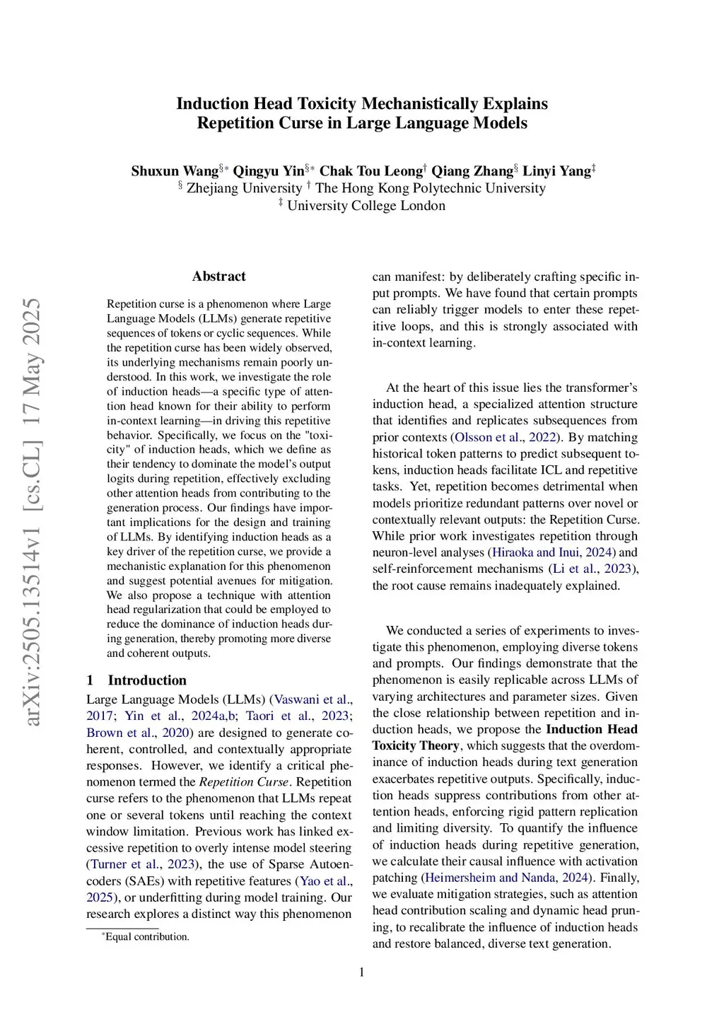 Repetition curse is a phenomenon where Large Language Models (LLMs) generate repetitive sequences of tokens or cyclic sequences. While the repetition curse has been widely observed, its underlying mechanisms remain poorly understood. In this work, we investigate the role of induction heads--a specific type of attention head known for their ability to perform in-context learning--in driving this repetitive behavior. Specifically, we focus on the "toxicity" of induction heads, which we define as their tendency to dominate the model's output logits during repetition, effectively excluding other attention heads from contributing to the generation process. Our findings have important implications for the design and training of LLMs. By identifying induction heads as a key driver of the repetition curse, we provide a mechanistic explanation for this phenomenon and suggest potential avenues for mitigation. We also propose a technique with attention head regularization that could be employed to reduce the dominance of induction heads during generation, thereby promoting more diverse and coherent outputs.