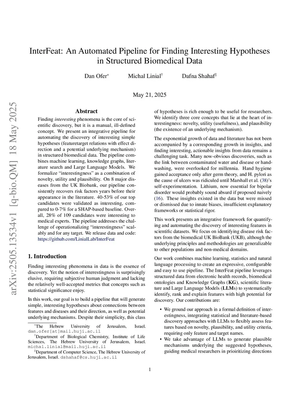 Finding interesting phenomena is the core of scientific discovery, but it is a manual, ill-defined concept. We present an integrative pipeline for automating the discovery of interesting simple hypotheses (feature-target relations with effect direction and a potential underlying mechanism) in structured biomedical data. The pipeline combines machine learning, knowledge graphs, literature search and Large Language Models. We formalize "interestingness" as a combination of novelty, utility and plausibility. On 8 major diseases from the UK Biobank, our pipeline consistently recovers risk factors years before their appearance in the literature. 40--53% of our top candidates were validated as interesting, compared to 0--7% for a SHAP-based baseline. Overall, 28% of 109 candidates were interesting to medical experts. The pipeline addresses the challenge of operationalizing "interestingness" scalably and for any target. We release data and code:this https URL