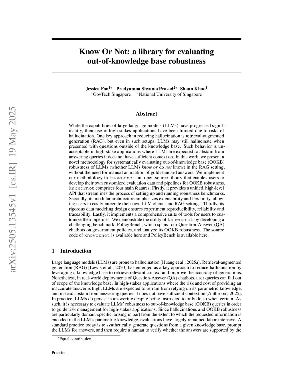 While the capabilities of large language models (LLMs) have progressed significantly, their use in high-stakes applications have been limited due to risks of hallucination. One key approach in reducing hallucination is retrieval-augmented generation (RAG), but even in such setups, LLMs may still hallucinate when presented with questions outside of the knowledge base. Such behavior is unacceptable in high-stake applications where LLMs are expected to abstain from answering queries it does not have sufficient context on. In this work, we present a novel methodology for systematically evaluating out-of-knowledge base (OOKB) robustness of LLMs (whether LLMs know or do not know) in the RAG setting, without the need for manual annotation of gold standard answers. We implement our methodology in knowornot, an open-source library that enables users to develop their own customized evaluation data and pipelines for OOKB robustness. knowornot comprises four main features. Firstly, it provides a unified, high-level API that streamlines the process of setting up and running robustness benchmarks. Secondly, its modular architecture emphasizes extensibility and flexibility, allowing users to easily integrate their own LLM clients and RAG settings. Thirdly, its rigorous data modeling design ensures experiment reproducibility, reliability and traceability. Lastly, it implements a comprehensive suite of tools for users to customize their pipelines. We demonstrate the utility of knowornot by developing a challenging benchmark, PolicyBench, which spans four Question-Answer (QA) chatbots on government policies, and analyze its OOKB robustness. The source code of knowornot is available this https URL.