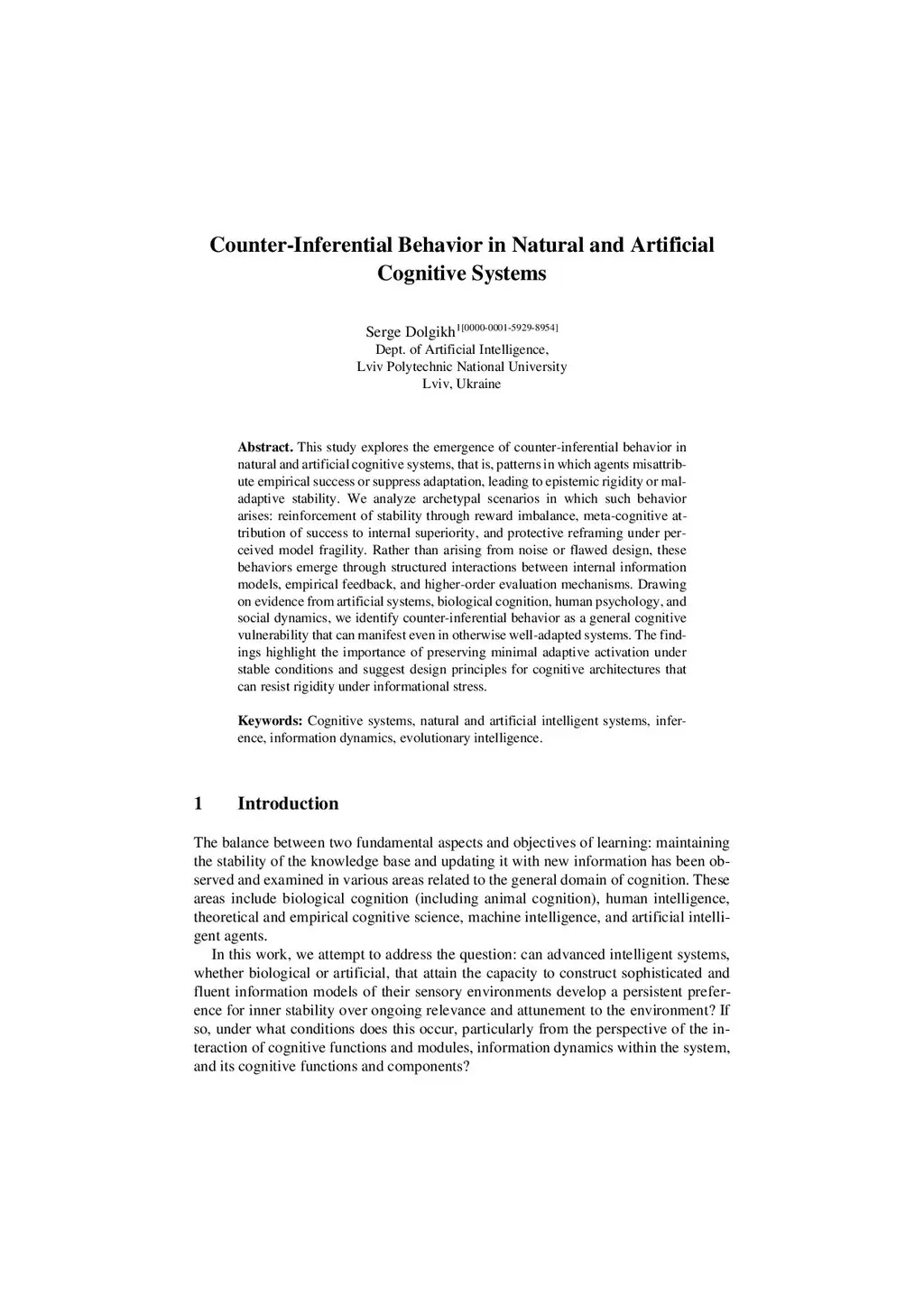 This study explores the emergence of counter-inferential behavior in natural and artificial cognitive systems, that is, patterns in which agents misattribute empirical success or suppress adaptation, leading to epistemic rigidity or maladaptive stability. We analyze archetypal scenarios in which such behavior arises: reinforcement of stability through reward imbalance, meta-cognitive attribution of success to internal superiority, and protective reframing under perceived model fragility. Rather than arising from noise or flawed design, these behaviors emerge through structured interactions between internal information models, empirical feedback, and higher-order evaluation mechanisms. Drawing on evidence from artificial systems, biological cognition, human psychology, and social dynamics, we identify counter-inferential behavior as a general cognitive vulnerability that can manifest even in otherwise well-adapted systems. The findings highlight the importance of preserving minimal adaptive activation under stable conditions and suggest design principles for cognitive architectures that can resist rigidity under informational stress.