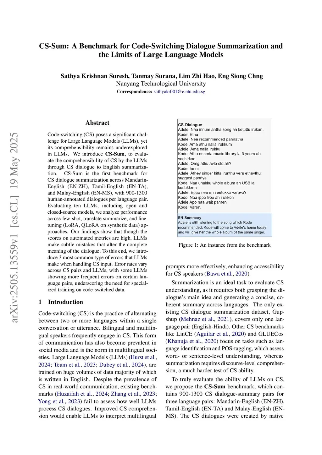 Code-switching (CS) poses a significant challenge for Large Language Models (LLMs), yet its comprehensibility remains underexplored in LLMs. We introduce CS-Sum, to evaluate the comprehensibility of CS by the LLMs through CS dialogue to English summarization. CS-Sum is the first benchmark for CS dialogue summarization across Mandarin-English (EN-ZH), Tamil-English (EN-TA), and Malay-English (EN-MS), with 900-1300 human-annotated dialogues per language pair. Evaluating ten LLMs, including open and closed-source models, we analyze performance across few-shot, translate-summarize, and fine-tuning (LoRA, QLoRA on synthetic data) approaches. Our findings show that though the scores on automated metrics are high, LLMs make subtle mistakes that alter the complete meaning of the dialogue. To this end, we introduce 3 most common type of errors that LLMs make when handling CS input. Error rates vary across CS pairs and LLMs, with some LLMs showing more frequent errors on certain language pairs, underscoring the need for specialized training on code-switched data.
