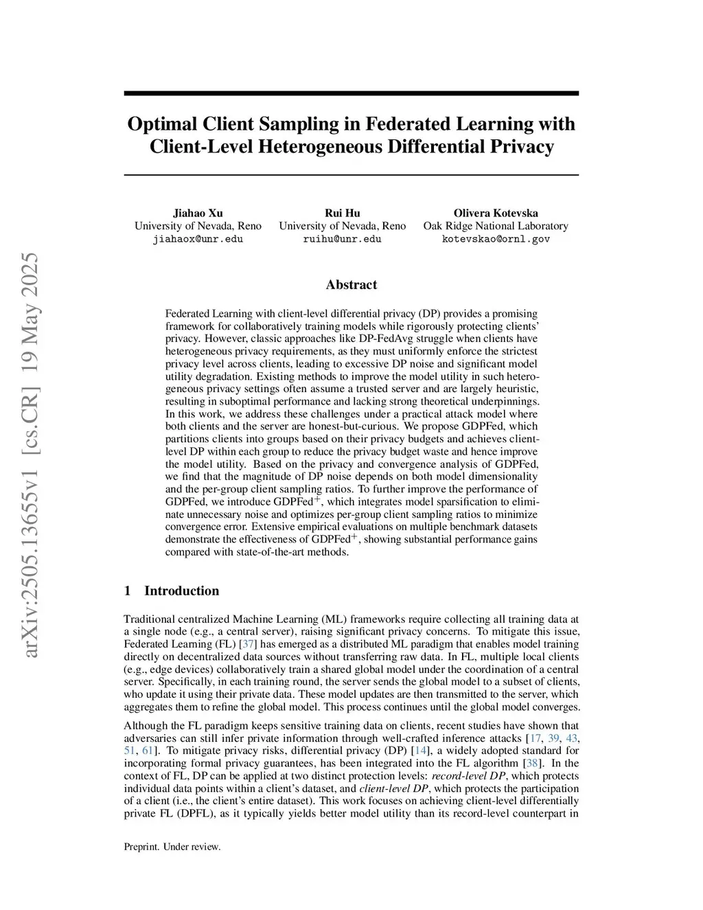 Federated Learning with client-level differential privacy (DP) provides a promising framework for collaboratively training models while rigorously protecting clients' privacy. However, classic approaches like DP-FedAvg struggle when clients have heterogeneous privacy requirements, as they must uniformly enforce the strictest privacy level across all clients, leading to excessive DP noise and significant degradation in model utility. Existing methods to improve the model utility in such heterogeneous privacy settings often assume a trusted server and are largely heuristic, resulting in suboptimal performance and lacking strong theoretical foundations. In this work, we address these challenges under a practical attack model where both clients and the server are honest-but-curious. We propose GDPFed, which partitions clients into groups based on their privacy budgets and achieves client-level DP within each group to reduce the privacy budget waste and hence improve the model utility. Based on the privacy and convergence analysis of GDPFed, we find that the magnitude of DP noise depends on both model dimensionality and the per-group client sampling ratios. To further improve the performance of GDPFed, we introduce GDPFed, which integrates model sparsification to eliminate unnecessary noise and optimizes per-group client sampling ratios to minimize convergence error. Extensive empirical evaluations on multiple benchmark datasets demonstrate the effectiveness of GDPFed, showing substantial performance gains compared with state-of-the-art methods.