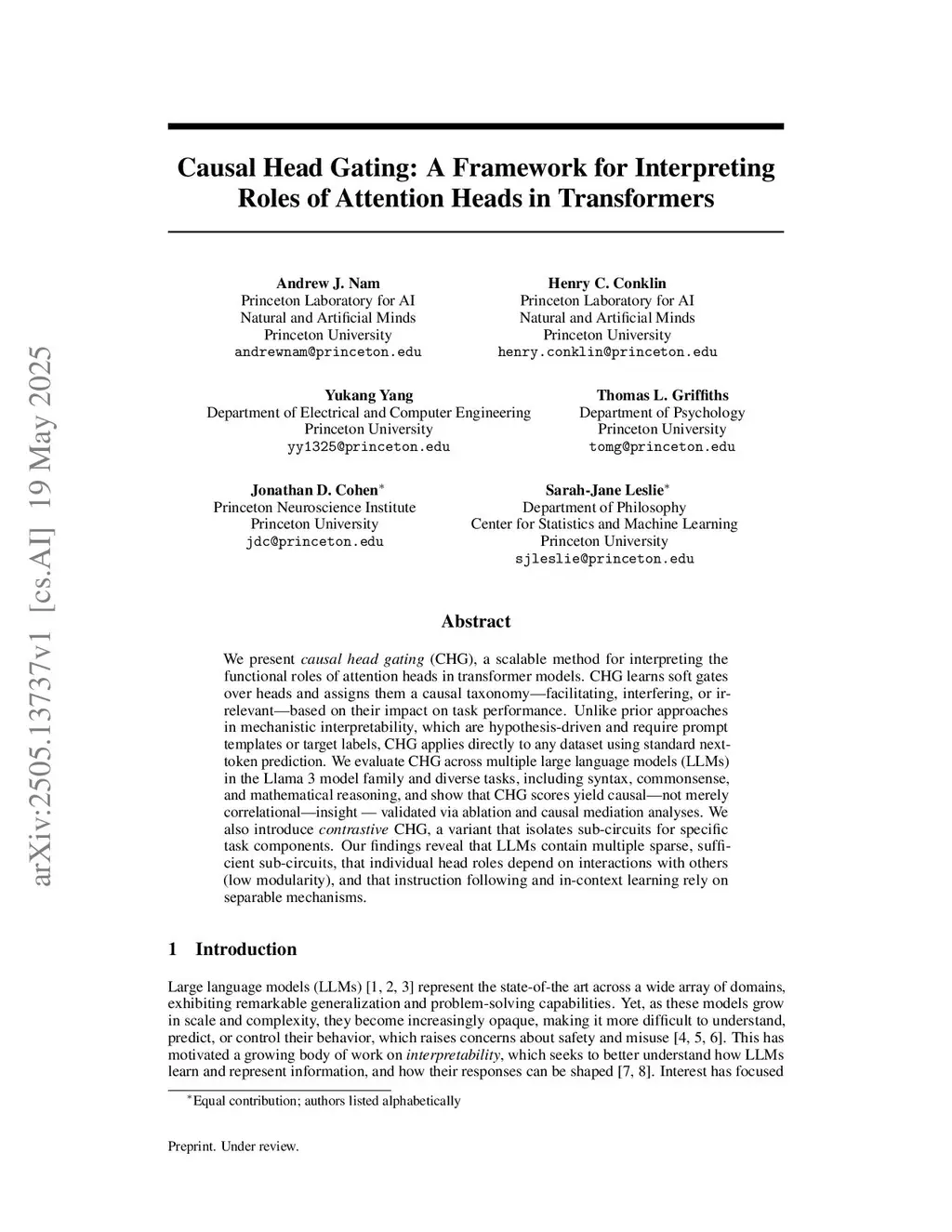 We present causal head gating (CHG), a scalable method for interpreting the functional roles of attention heads in transformer models. CHG learns soft gates over heads and assigns them a causal taxonomy - facilitating, interfering, or irrelevant - based on their impact on task performance. Unlike prior approaches in mechanistic interpretability, which are hypothesis-driven and require prompt templates or target labels, CHG applies directly to any dataset using standard next-token prediction. We evaluate CHG across multiple large language models (LLMs) in the Llama 3 model family and diverse tasks, including syntax, commonsense, and mathematical reasoning, and show that CHG scores yield causal, not merely correlational, insight validated via ablation and causal mediation analyses. We also introduce contrastive CHG, a variant that isolates sub-circuits for specific task components. Our findings reveal that LLMs contain multiple sparse task-sufficient sub-circuits, that individual head roles depend on interactions with others (low modularity), and that instruction following and in-context learning rely on separable mechanisms.