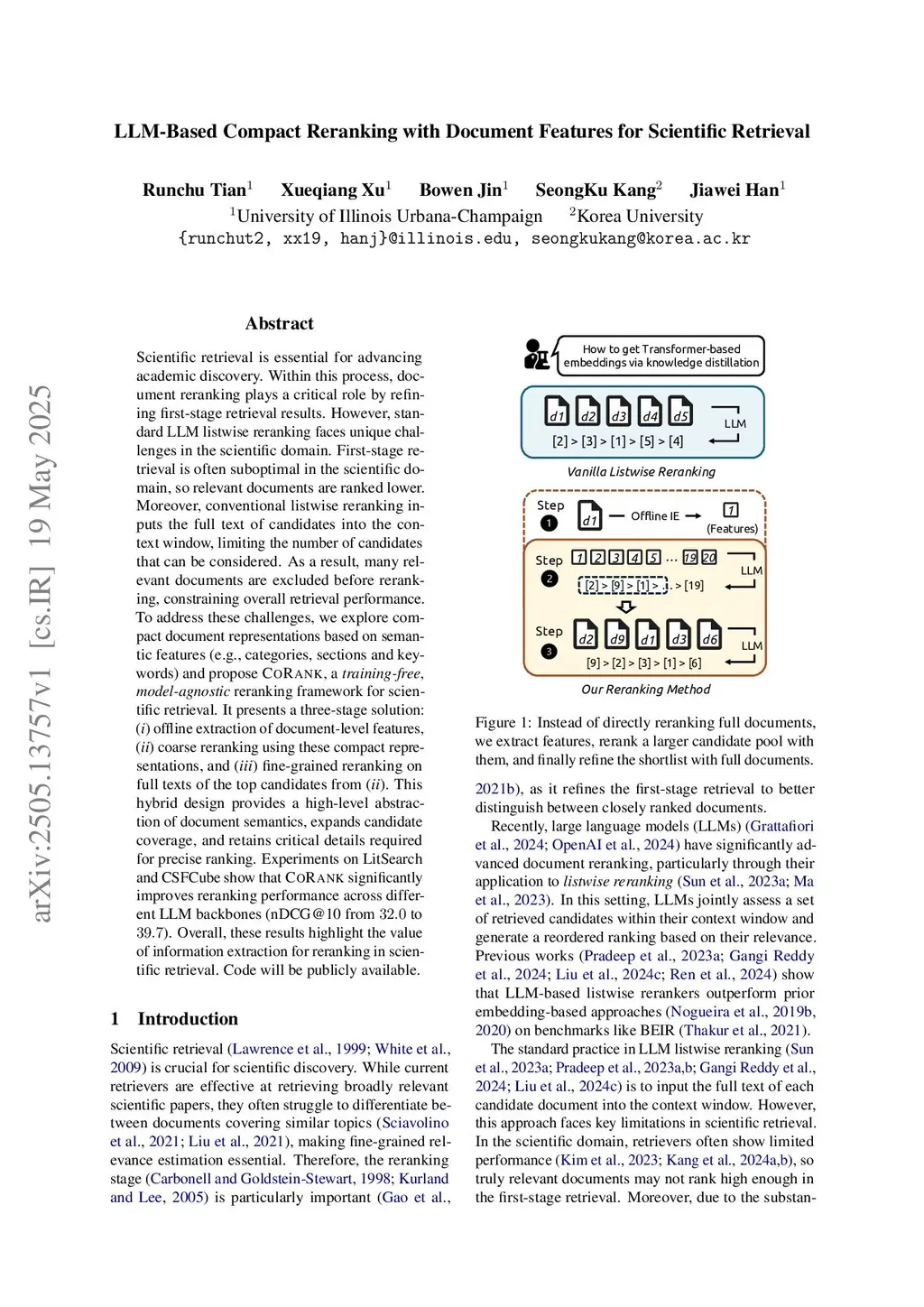 LLM-Based Compact Reranking with Document Features for Scientific Retrieval