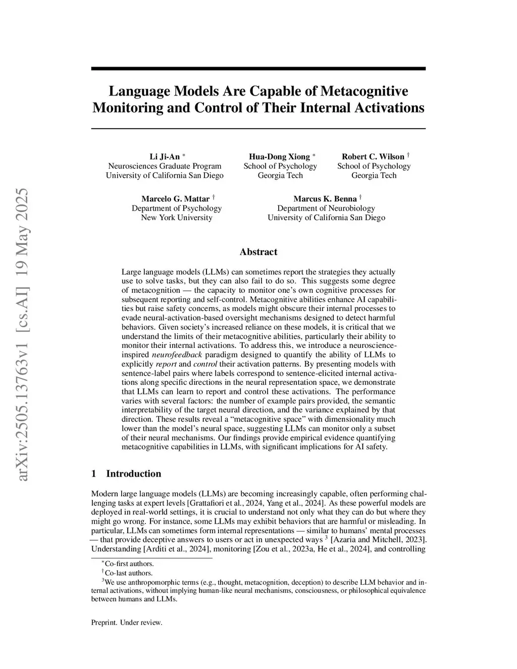 Large language models (LLMs) can sometimes report the strategies they actually use to solve tasks, yet at other times seem unable to recognize those strategies that govern their behavior. This suggests a limited degree of metacognition - the capacity to monitor one's own cognitive processes for subsequent reporting and self-control. Metacognition enhances LLMs' capabilities in solving complex tasks but also raises safety concerns, as models may obfuscate their internal processes to evade neural-activation-based oversight (e.g., safety detector). Given society's increased reliance on these models, it is critical that we understand their metacognitive abilities. To address this, we introduce a neuroscience-inspired neurofeedback paradigm that uses in-context learning to quantify metacognitive abilities of LLMs to report and control their activation patterns. We demonstrate that their abilities depend on several factors: the number of in-context examples provided, the semantic interpretability of the neural activation direction (to be reported/controlled), and the variance explained by that direction. These directions span a "metacognitive space" with dimensionality much lower than the model's neural space, suggesting LLMs can monitor only a small subset of their neural activations. Our paradigm provides empirical evidence to quantify metacognition in LLMs, with significant implications for AI safety (e.g., adversarial attack and defense).