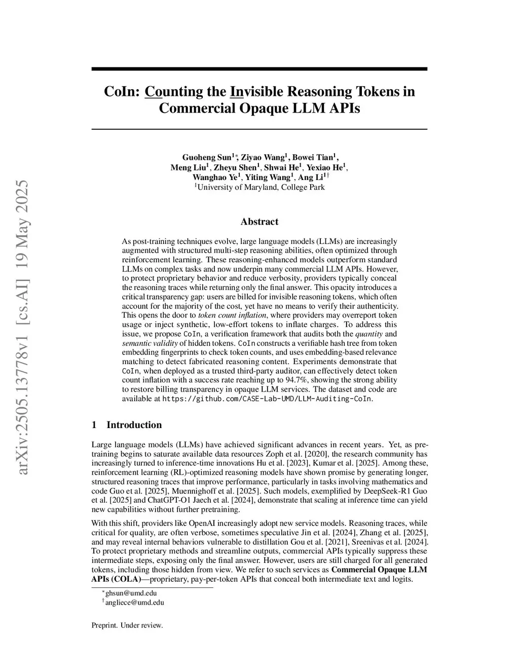 CoIn: Counting the Invisible Reasoning Tokens in Commercial Opaque LLM APIs