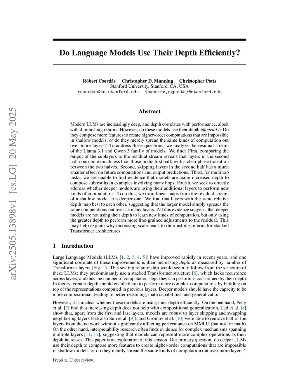 Modern LLMs are increasingly deep, and depth correlates with performance, albeit with diminishing returns. However, do these models use their depth efficiently? Do they compose more features to create higher-order computations that are impossible in shallow models, or do they merely spread the same kinds of computation out over more layers? To address these questions, we analyze the residual stream of the Llama 3.1, Qwen 3, and OLMo 2 family of models. We find: First, comparing the output of the sublayers to the residual stream reveals that layers in the second half contribute much less than those in the first half, with a clear phase transition between the two halves. Second, skipping layers in the second half has a much smaller effect on future computations and output predictions. Third, for multihop tasks, we are unable to find evidence that models are using increased depth to compose subresults in examples involving many hops. Fourth, we seek to directly address whether deeper models are using their additional layers to perform new kinds of computation. To do this, we train linear maps from the residual stream of a shallow model to a deeper one. We find that layers with the same relative depth map best to each other, suggesting that the larger model simply spreads the same computations out over its many layers. All this evidence suggests that deeper models are not using their depth to learn new kinds of computation, but only using the greater depth to perform more fine-grained adjustments to the residual. This may help explain why increasing scale leads to diminishing returns for stacked Transformer architectures.