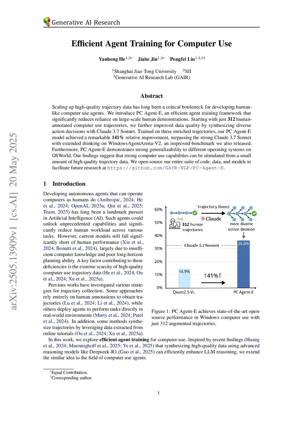 Scaling up high-quality trajectory data has long been a critical bottleneck for developing human-like computer use agents. We introduce PC Agent-E, an efficient agent training framework that significantly reduces reliance on large-scale human demonstrations. Starting with just 312 human-annotated computer use trajectories, we further augment them by synthesizing diverse alternative action decisions with Claude 3.7 Sonnet. Trained on these enriched trajectories, our PC Agent-E model achieved a remarkable 141 relative improvement, and even surpassed the Claude 3.7 Sonnet by 10% in relative terms on WindowsAgentArena-V2, an improved benchmark we also released. By integrating robust human computer use skills with automated AI data synthesis capabilities, our method not only brought substantial improvements over training on human trajectories alone, but also significantly surpassed direct distillation from Claude 3.7 Sonnet. Code, data and models are available atthis https URL