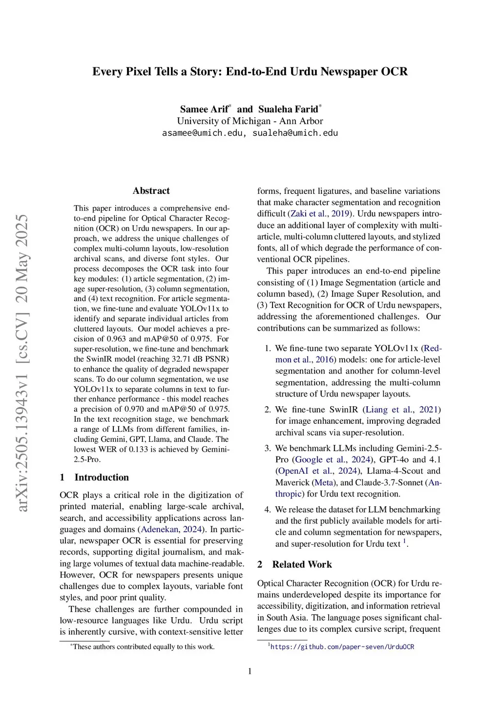 This paper presents a comparative analysis of Large Language Models (LLMs) and traditional Optical Character Recognition (OCR) systems on Urdu newspapers, addressing challenges posed by complex multi-column layouts, low-resolution scans, and the stylistic variability of the Nastaliq script. To handle these challenges, we fine-tune YOLOv11x models for article- and column-level text block extraction and train a SwinIR-based super-resolution module that enhances image quality for downstream text recognition, improving accuracy by an average of 50%. We further introduce the Urdu Newspaper Benchmark (UNB), a manually annotated dataset for Urdu OCR comprising 829 paragraph images with a total of 9,982 sentences. Using UNB and the OpenITI corpus, we conduct a systematic comparison between traditional CNN+RNN-based OCR systems and modern LLMs, presenting detailed insertion, deletion, and substitution error analyses alongside character-level confusion patterns. We find that Gemini-2.5-Pro achieves the best performance on UNB (WER 0.133), while fine-tuning GPT-4o on just 500 in-domain samples yields a 6.13% absolute WER improvement, demonstrating the adaptability of LLMs to low-resource, morphologically complex scripts like Urdu. The UNB dataset and fine-tuned models are publicly available atthis https URL.