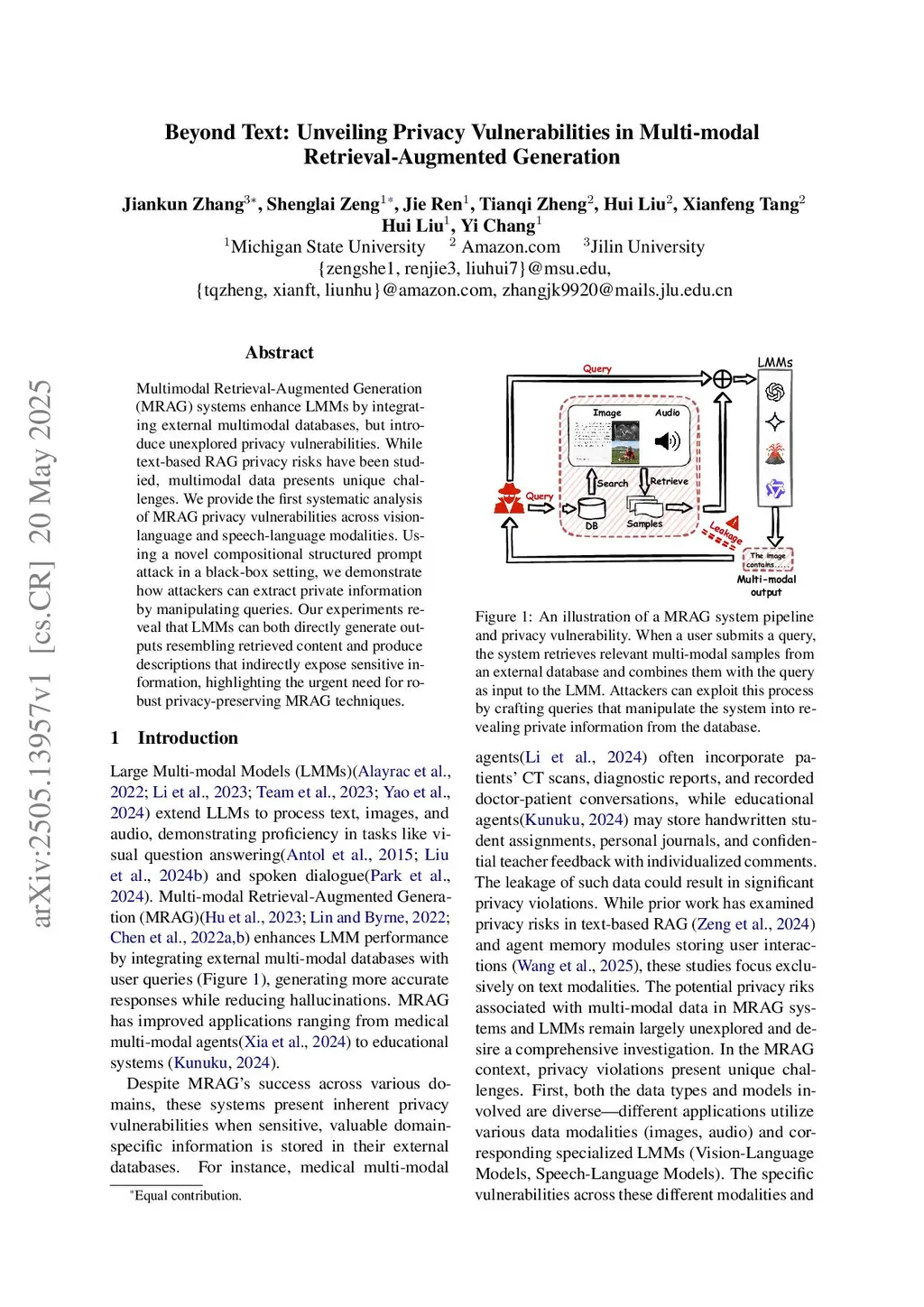 Multimodal Retrieval-Augmented Generation (MRAG) systems enhance LMMs by integrating external multimodal databases, but introduce unexplored privacy vulnerabilities. While text-based RAG privacy risks have been studied, multimodal data presents unique challenges. We provide the first systematic analysis of MRAG privacy vulnerabilities across vision-language and speech-language modalities. Using a novel compositional structured prompt attack in a black-box setting, we demonstrate how attackers can extract private information by manipulating queries. Our experiments reveal that LMMs can both directly generate outputs resembling retrieved content and produce descriptions that indirectly expose sensitive information, highlighting the urgent need for robust privacy-preserving MRAG techniques.
